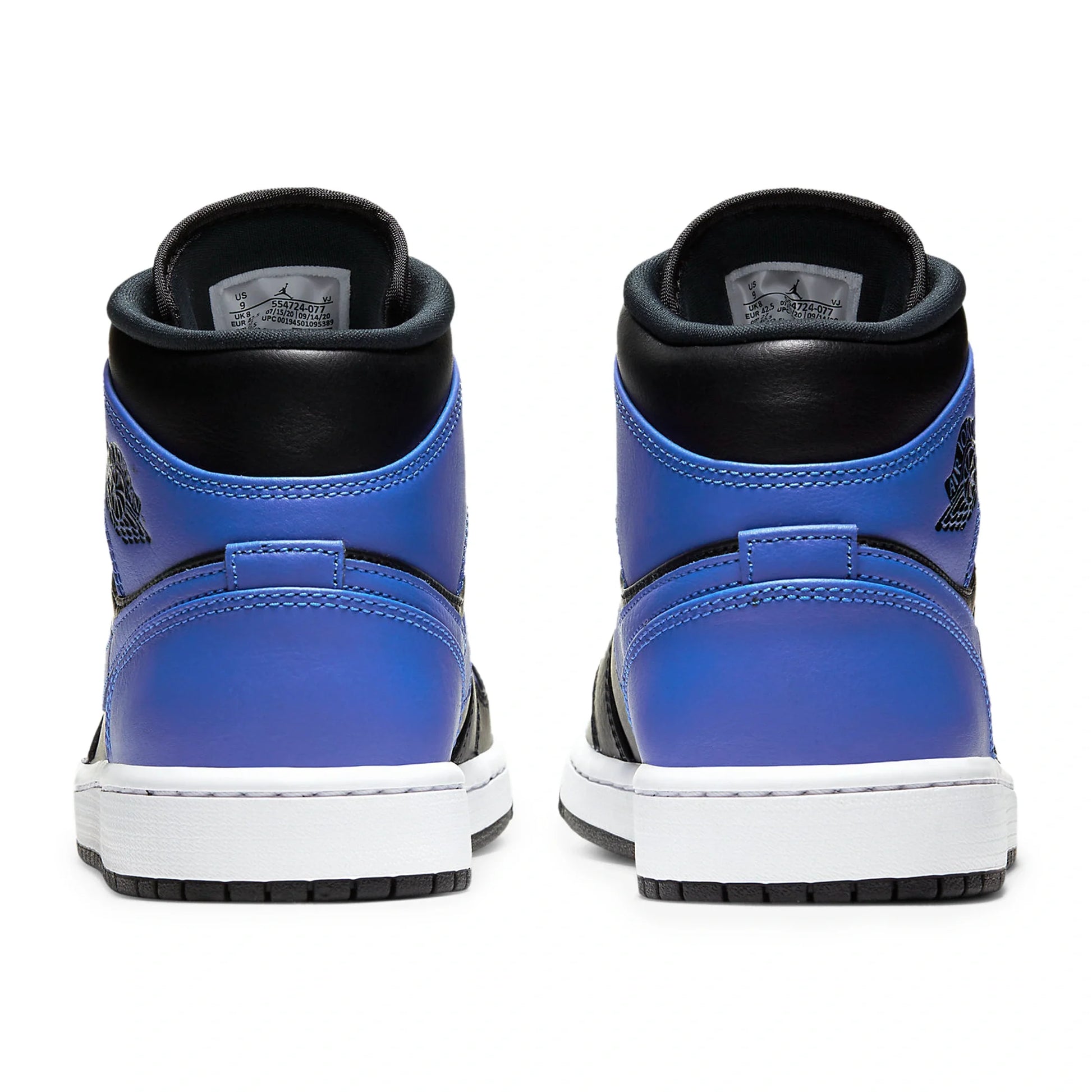 The Air Jordan 1 Mid Hyper Royal features a supple tumbled leather base. A two-tone colour block makes up the design, with royal blue overlays on a black base. A mini Jumpman logo in a lighter blue on the tongue stands out. Finally, a white midsole with a black outsole completes the design. Add this pair to your sneaker collection today.