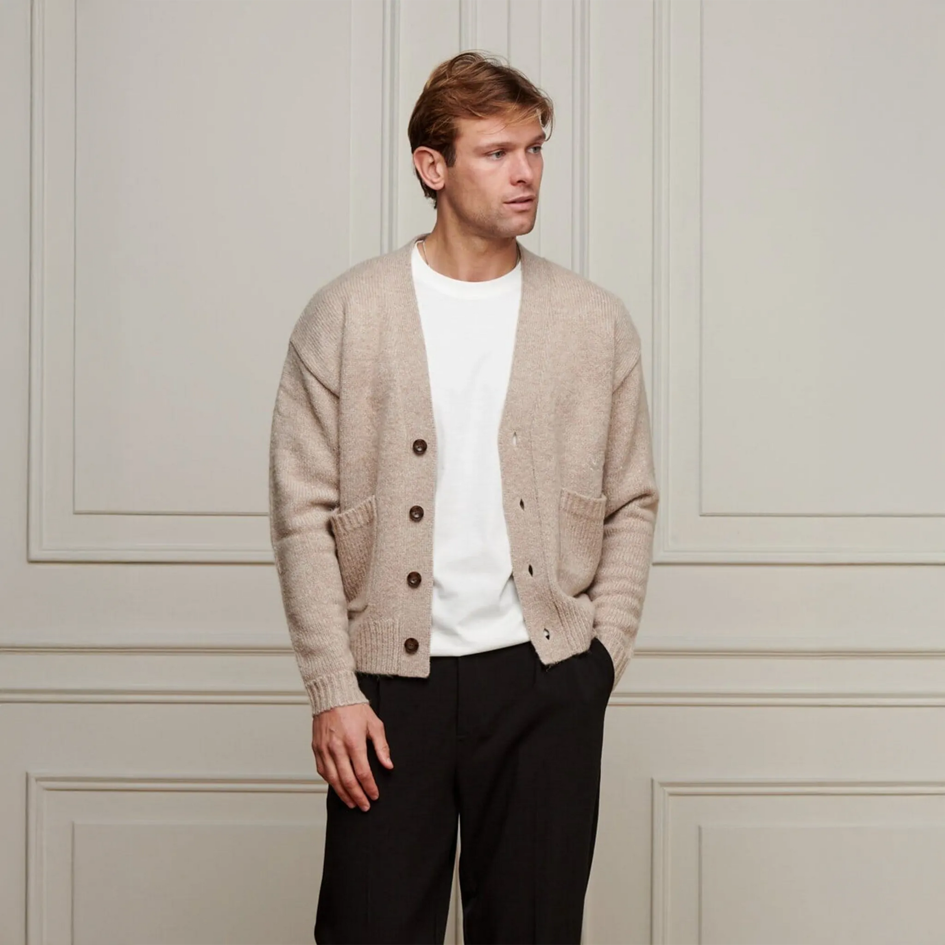 Update your rotation with the Belier Relaxed Fit Knitted Cardigan in beige. The heathered knit feels soft and easy, cut with a roomy drop shoulder and deep V. Horn-look buttons, twin patch pockets, and ribbed cuffs bring classic cardigan vibes, while a subtle chest logo keeps it clean. Throw it over a tee or shirt from the office to off duty. Secure yours now.