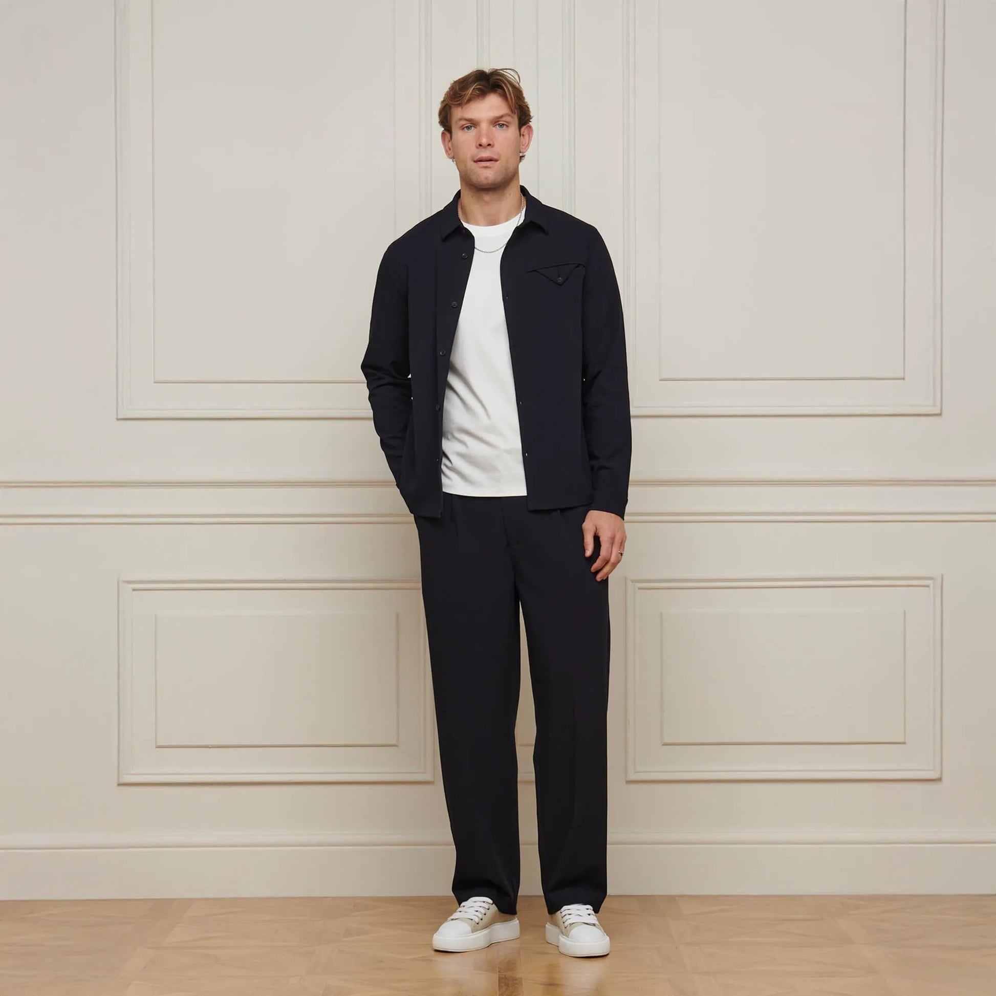 Belier Relaxed Fit Trousers arrive in deep navy with an easy straight leg. The soft stretch fabric feels light and keeps its shape, while a smooth waistband and subtle crease keep things tidy. Finished with side pockets for the basics. Style them with a tee and trainers or a shirt for dinner plans. Don’t miss out, get yours now.