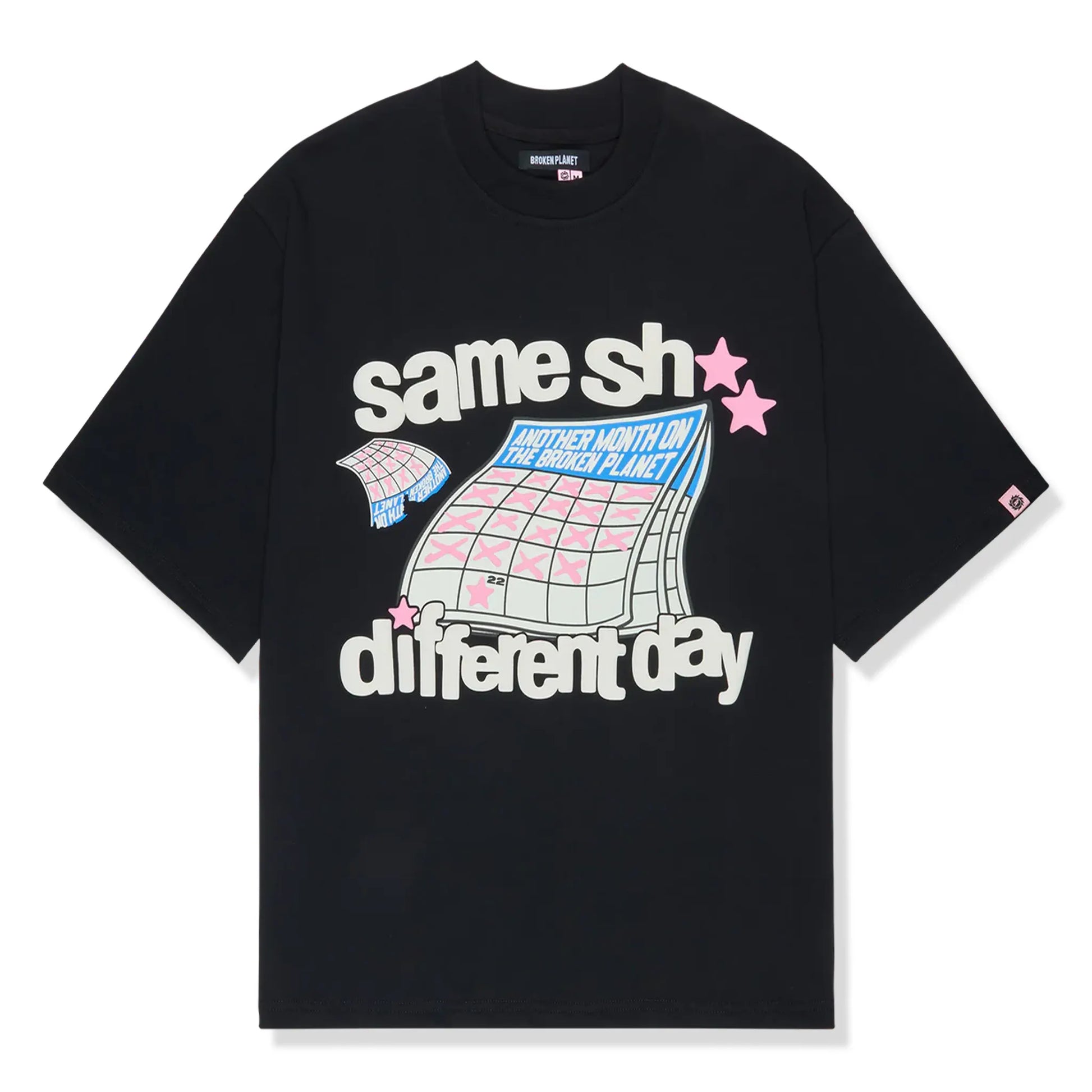 Shake up your rotation with the Broken Planet Different Day Midnight Black T Shirt. Cut roomy from heavy cotton, it lands in a deep black shade with a bold front hit that reads “same sh** different day,” stacked over a warped calendar and pink stars. A ribbed crew neck and drop shoulders keep it relaxed, while the pink sleeve badge signs it off. Grab one before it’s gone.