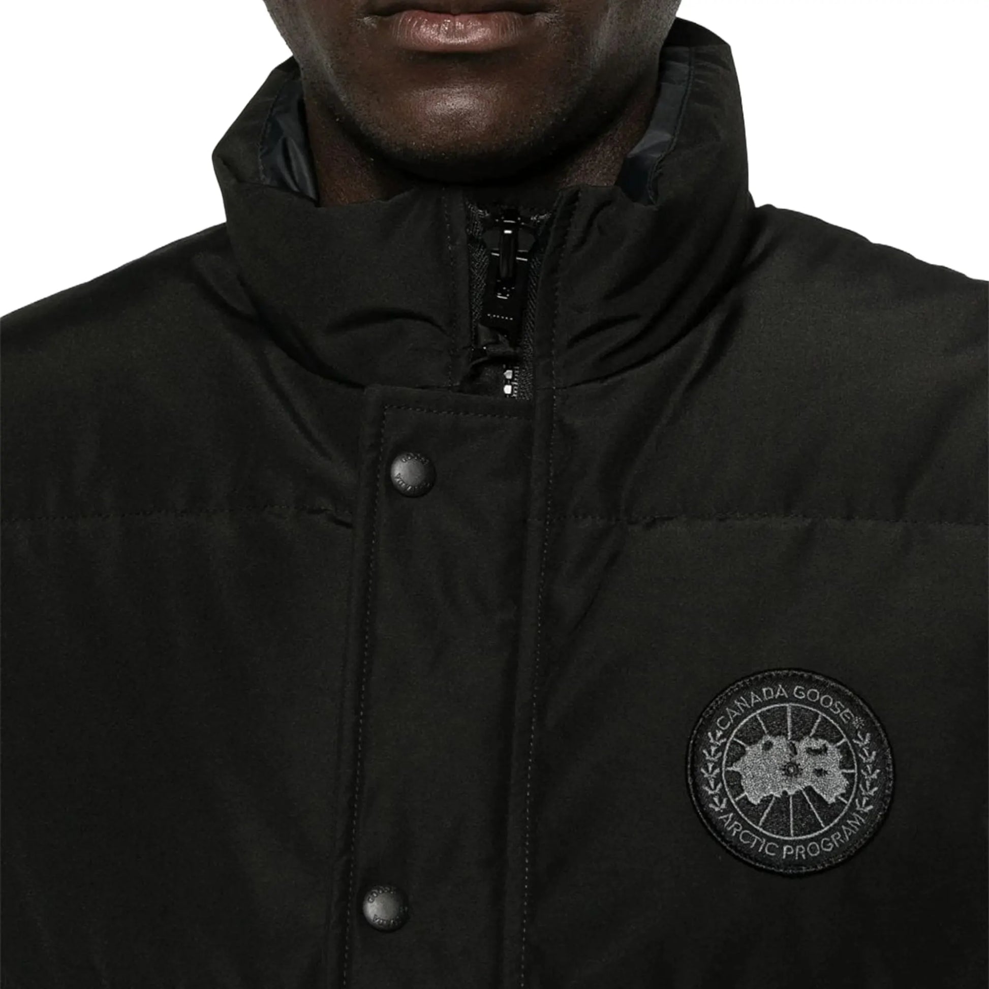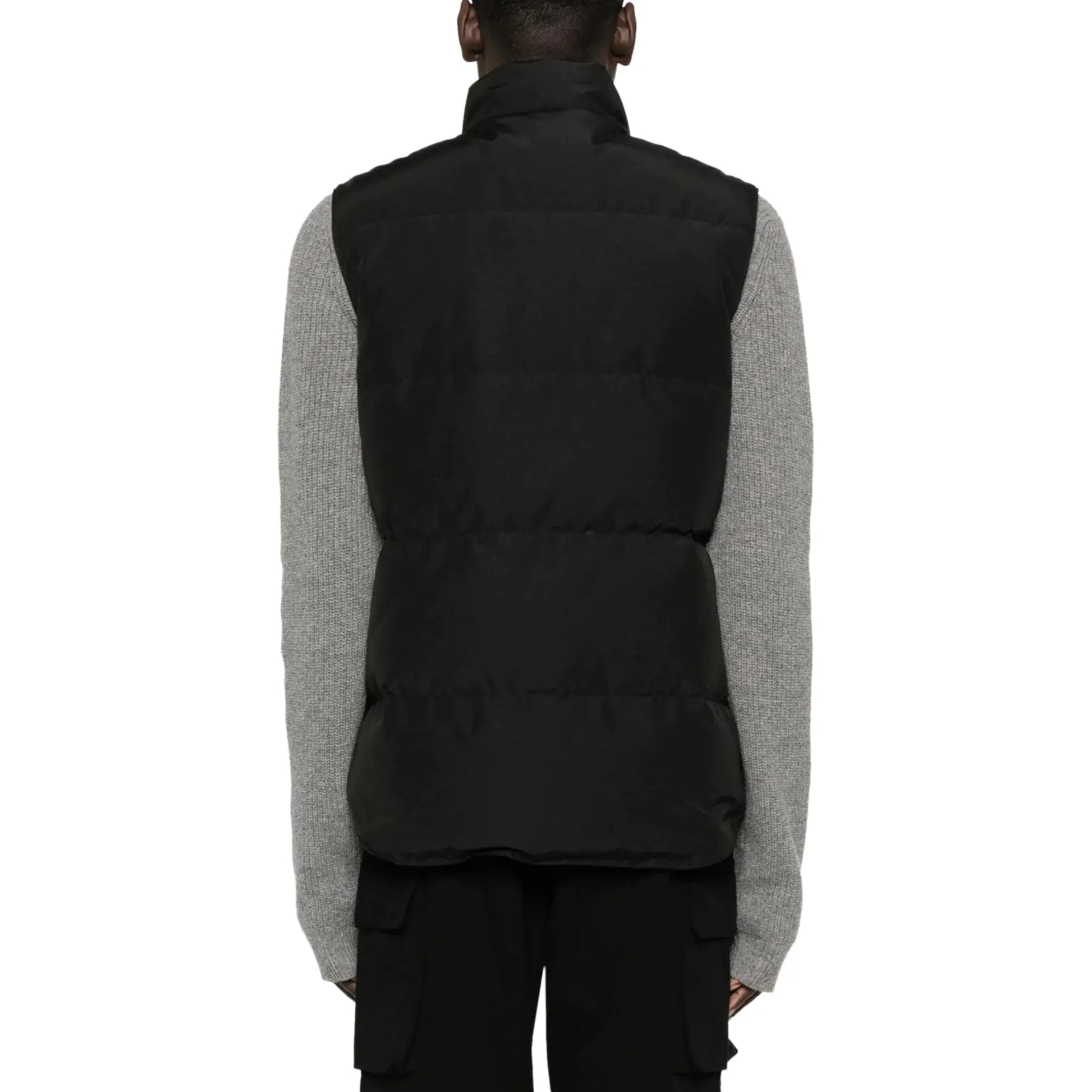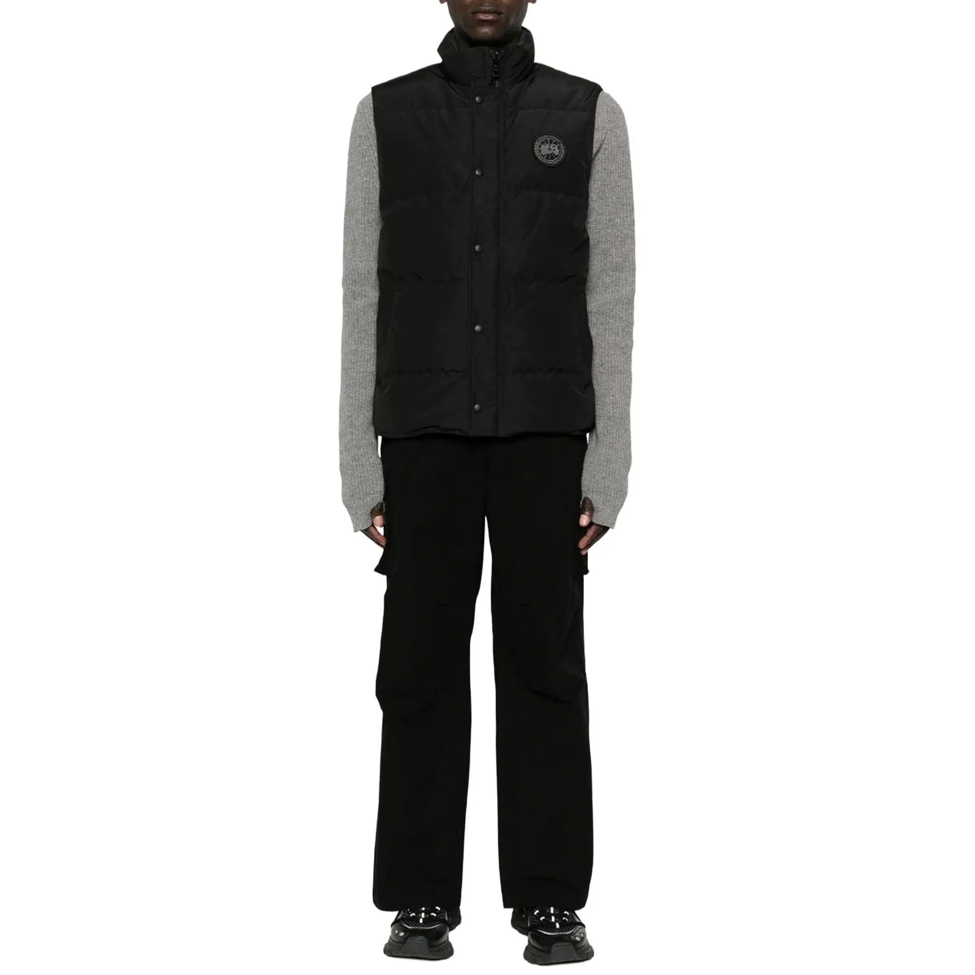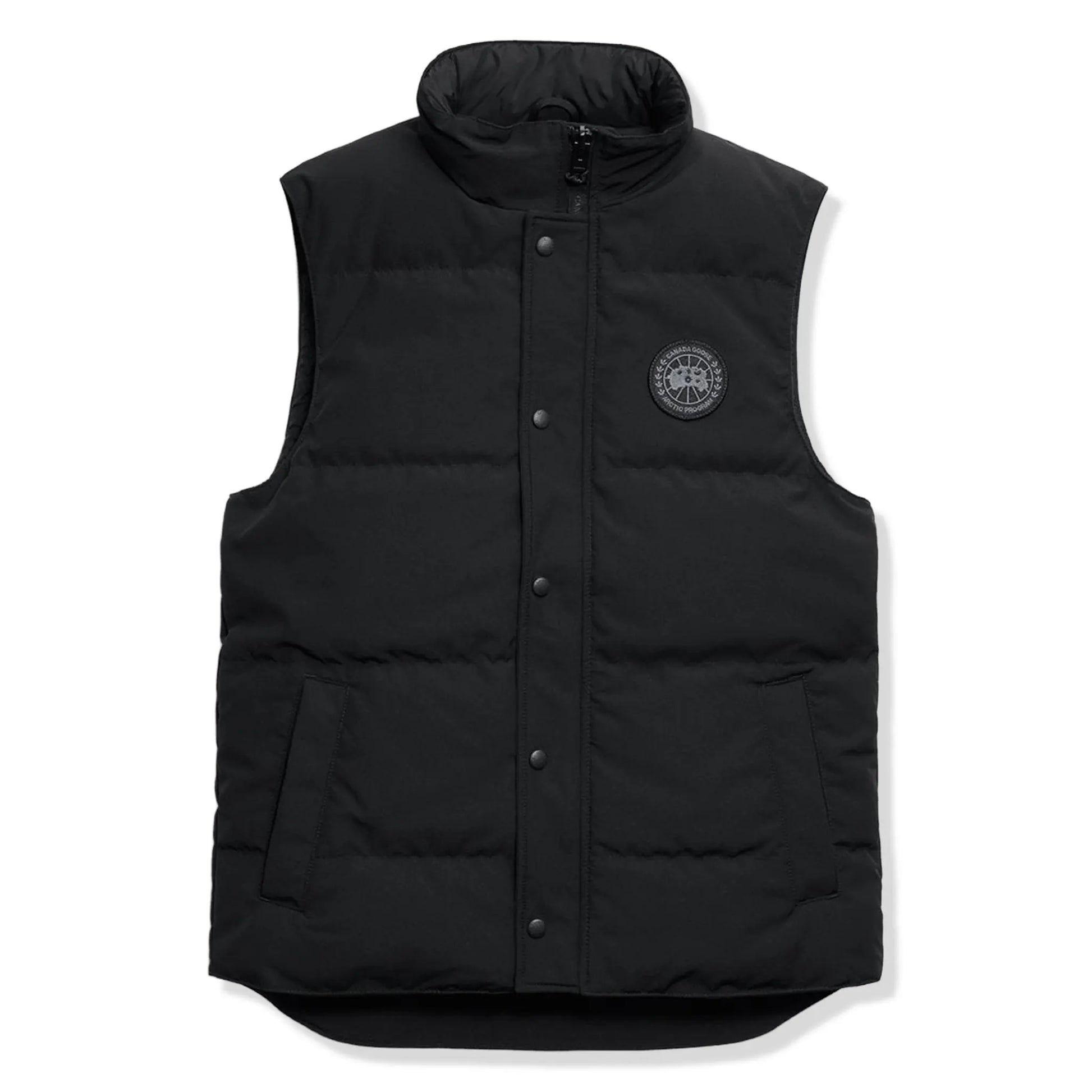 Stay warm in streamlined style with the Canada Goose Garson Black Gilet. The insulated body, high stand collar and snap over zip seal in heat, while the matte finish and tonal Black Disc patch keep things low key. Handy side pockets carry the essentials, and a drop hem layers cleanly over knits or hoodies. A dependable outer layer for cold commutes and crisp city days.
