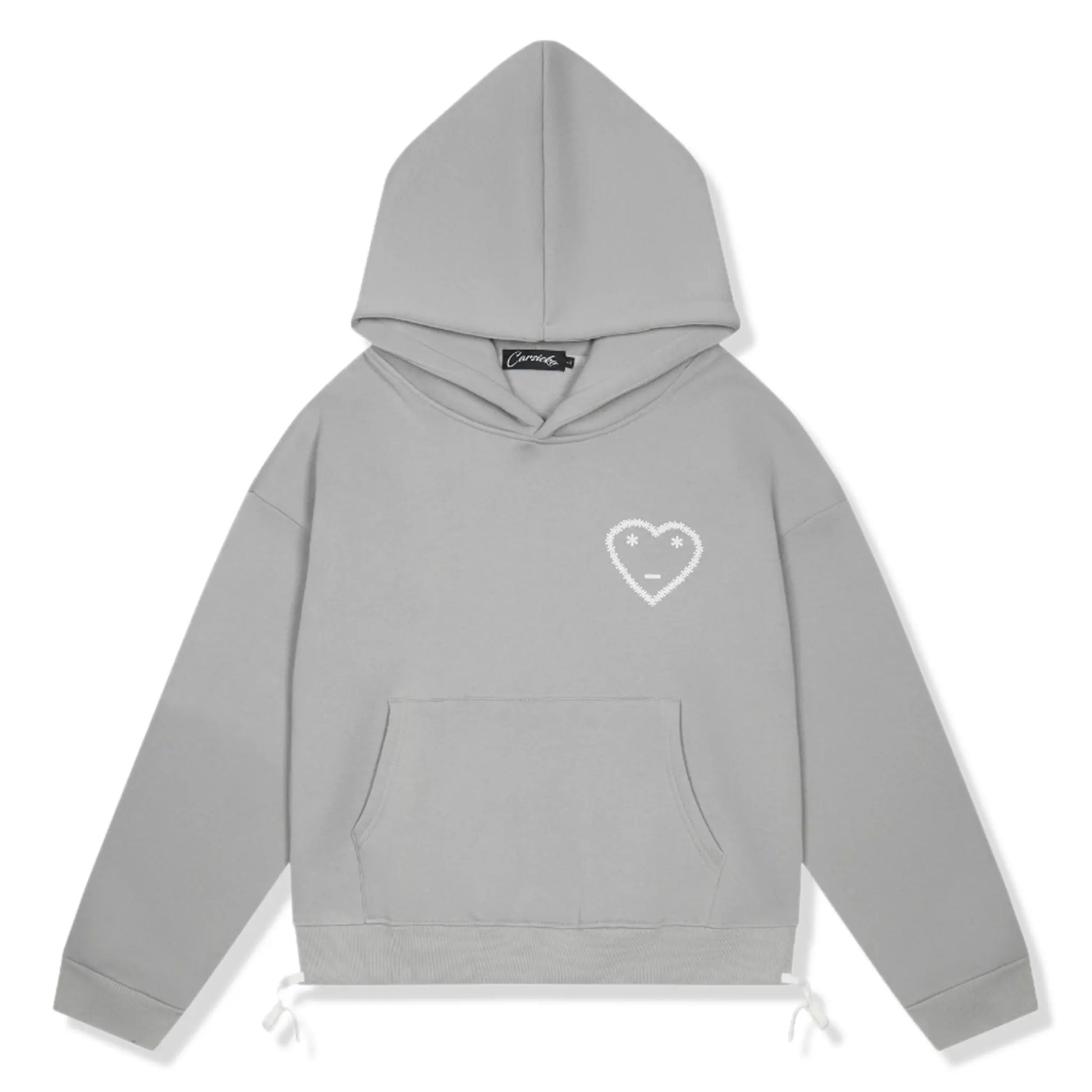 Update your rotation with the Carsicko Signature Grey Hoodie. Soft fleece-backed fabric meets a relaxed drop-shoulder cut, finished in clean heather grey. A stitched white heart face sits at the chest, while the roomy hood and front pouch keep things easy. Adjustable side hem ties let you tighten the fit, and ribbed cuffs lock in comfort. Throw it on with cargos and fresh sneakers. Secure yours now.