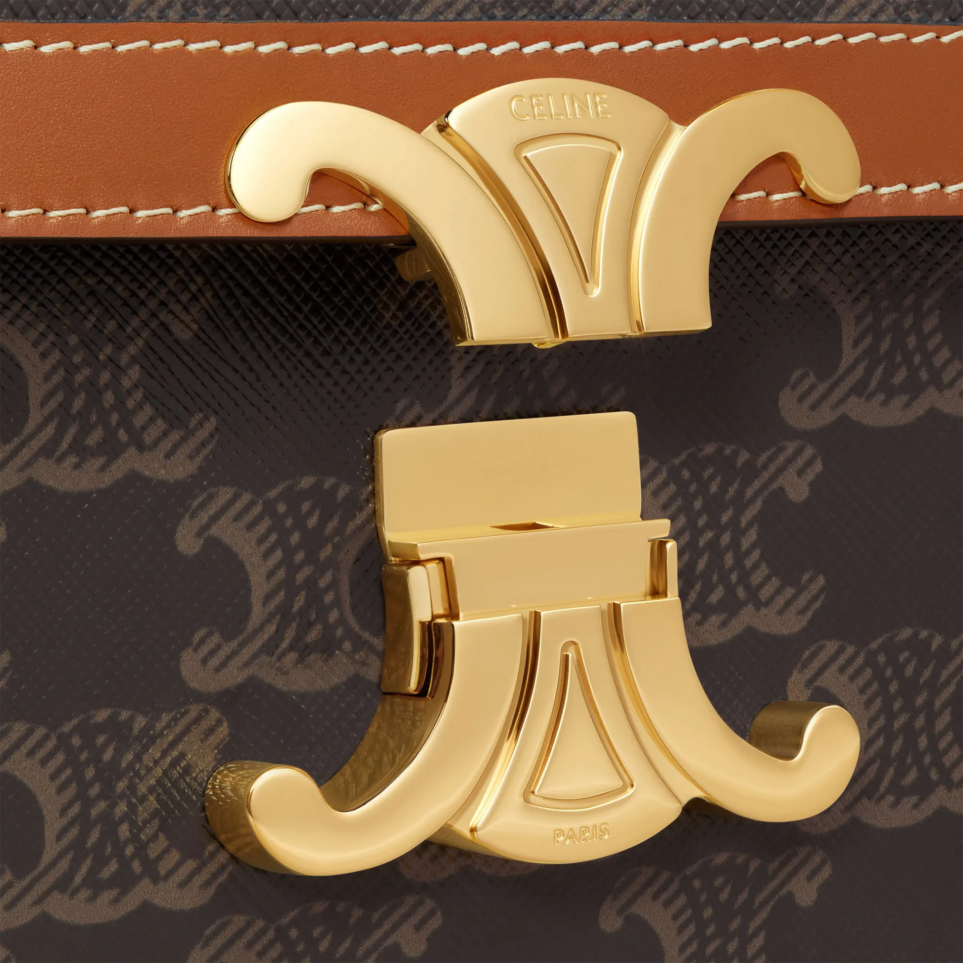 Complete your outfit with the Celine Classique Triomphe Shoulder Bag in tan. Signature Triomphe canvas meets smooth calfskin trims and crisp contrast stitching, framed by a gleaming gold clasp. The structured silhouette opens to a tidy interior with a zip pocket and accordion compartments, ideal for coffee runs to dinner plans. Finished with an adjustable strap for easy crossbody wear. Shop yours before they’re gone.