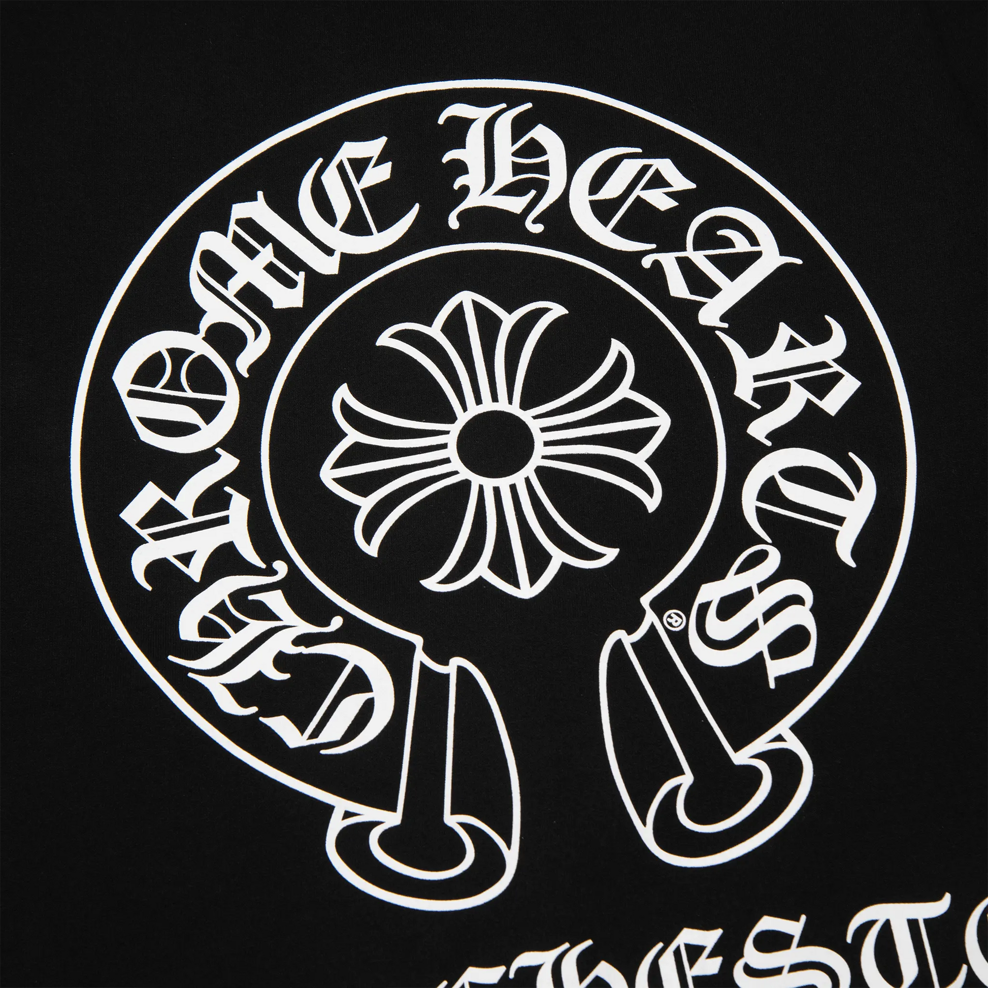 A striking statement item that combines the brand's distinctive edge with a dash of exclusivity is the Chrome Hearts Manchester Exclusive Horse Shoe Zip-Up Black Hoodie.  It has a distinctly Chrome Hearts vibe with to its Gothic-inspired patterns and distinctive cross embellishments on the chest and sleeves.