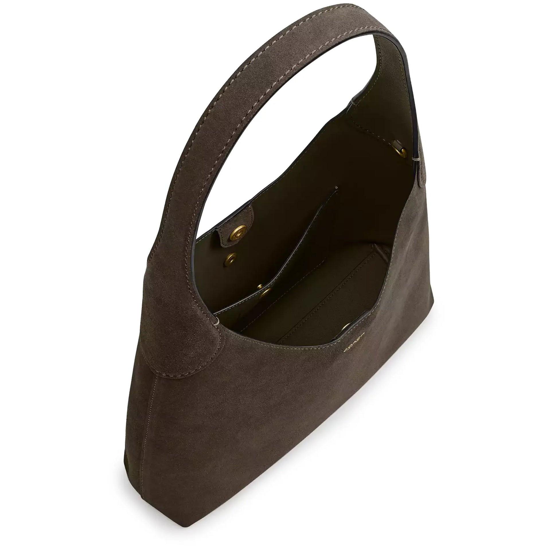 Complete your outfit with the Coach Brooklyn Shoulder Bag in olive. Soft suede finish and a clean U-shaped silhouette keep things minimalist. A single shoulder strap sits snug, while the front patch pocket with gold stud gives quick grab and go storage. Subtle gold hardware and a roomy main compartment make it an easy daily pick. Pair it with neutral layers. Secure yours now.