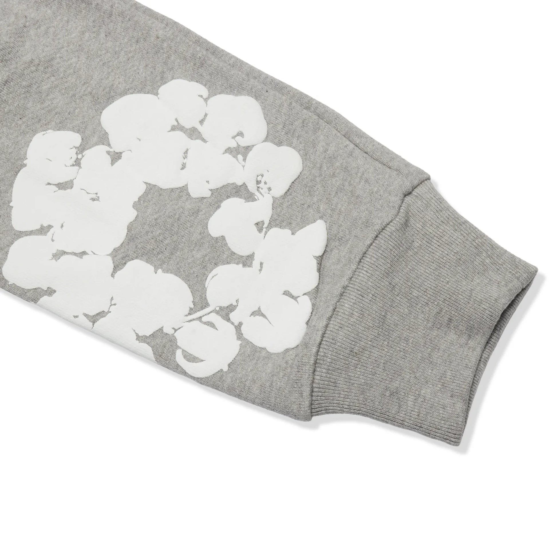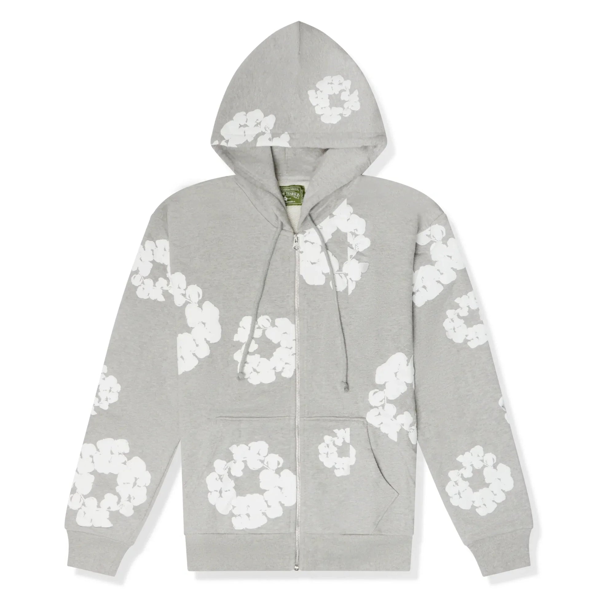 Bring a fresh look with Denim Tears Cotton Wreath Zip-Up in grey, a clean layer that hits street and gallery vibes alike. Soft midweight cotton fleece teams a full zip, drawstring hood, and rib trims for easy wear day to night. All over white cotton wreath graphics pop against the heather base, while split front pockets keep hands sorted. Grab yours today.