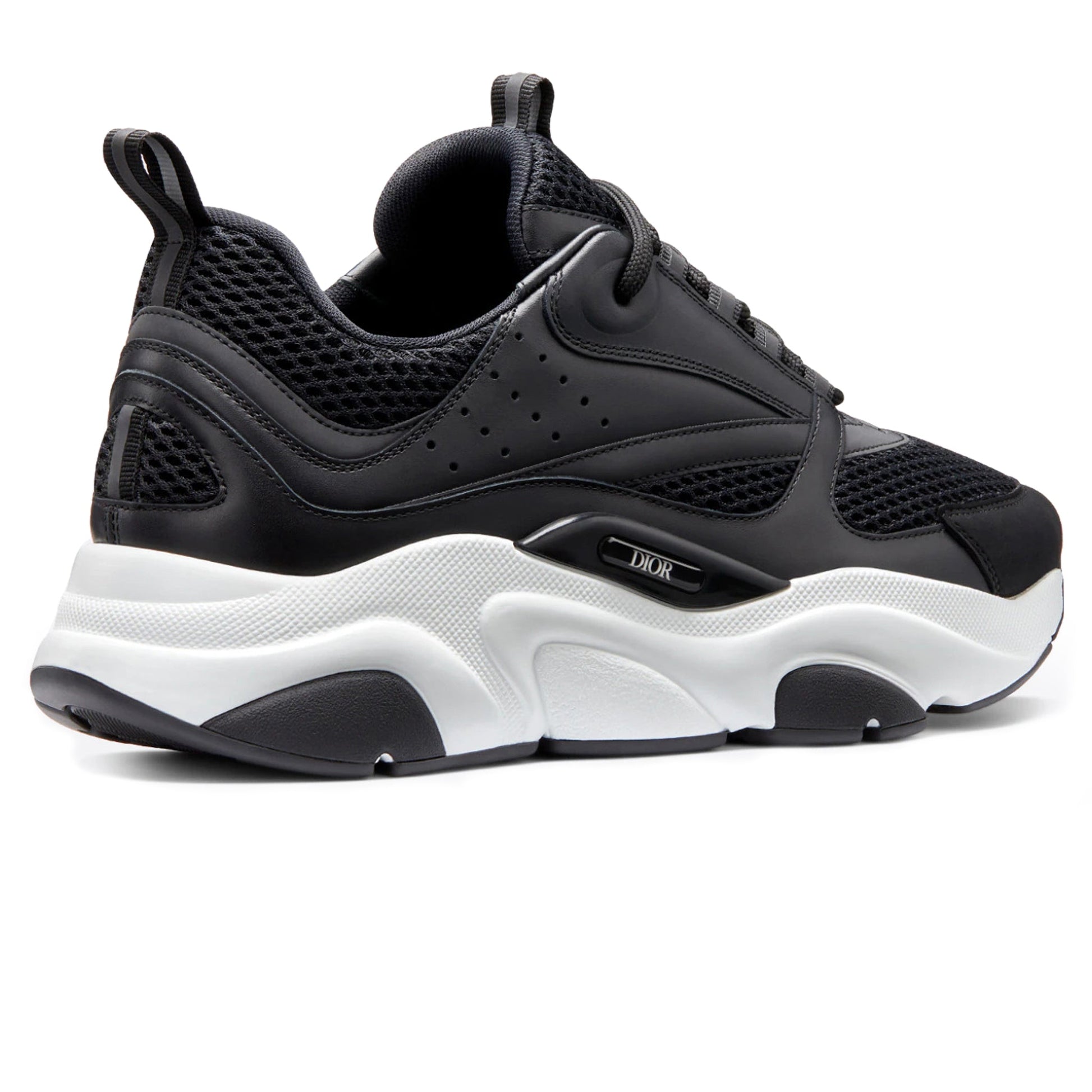 The B22 sneaker takes inspiration from retro running styles. The chunky low-top silhouette is defined by a black calfskin and mesh-paneled upper set on a sculpted white and black rubber sole. The black mesh tongue and heel counter are complemented by black laces, while an embossed 'DIOR' signature adorns the side. The sneaker can be contrasted with tailored suiting to add a fashionable sportswear touch.
