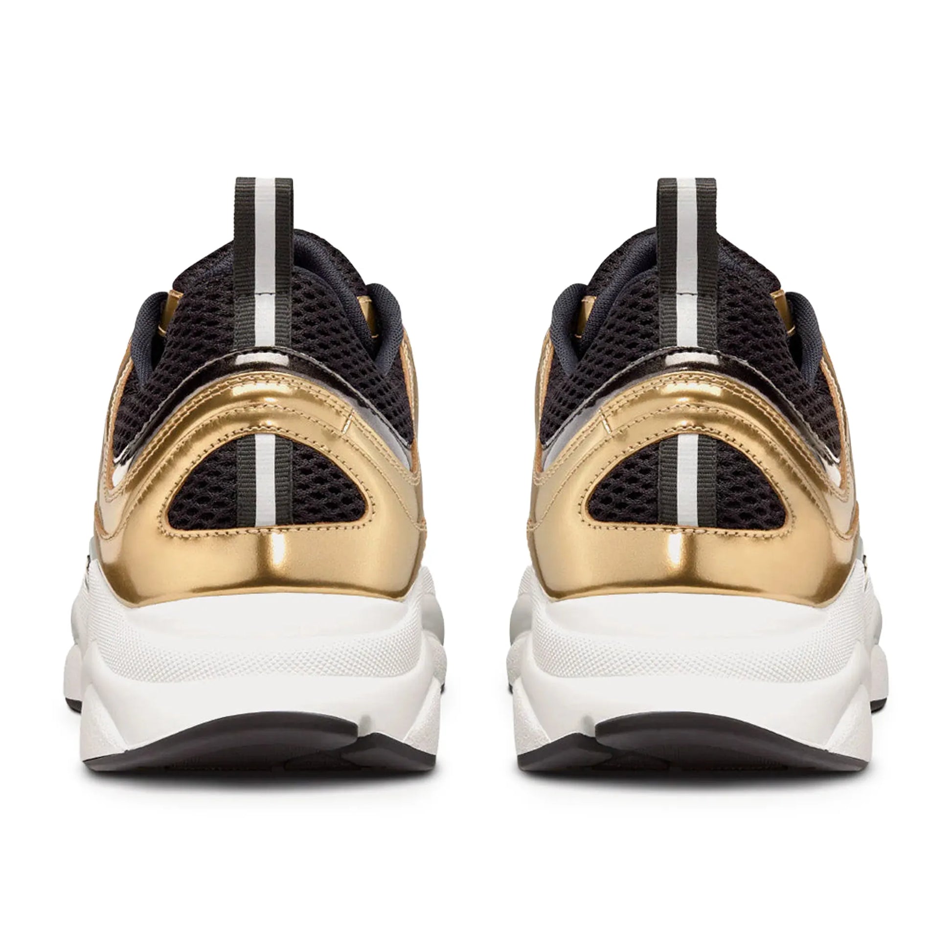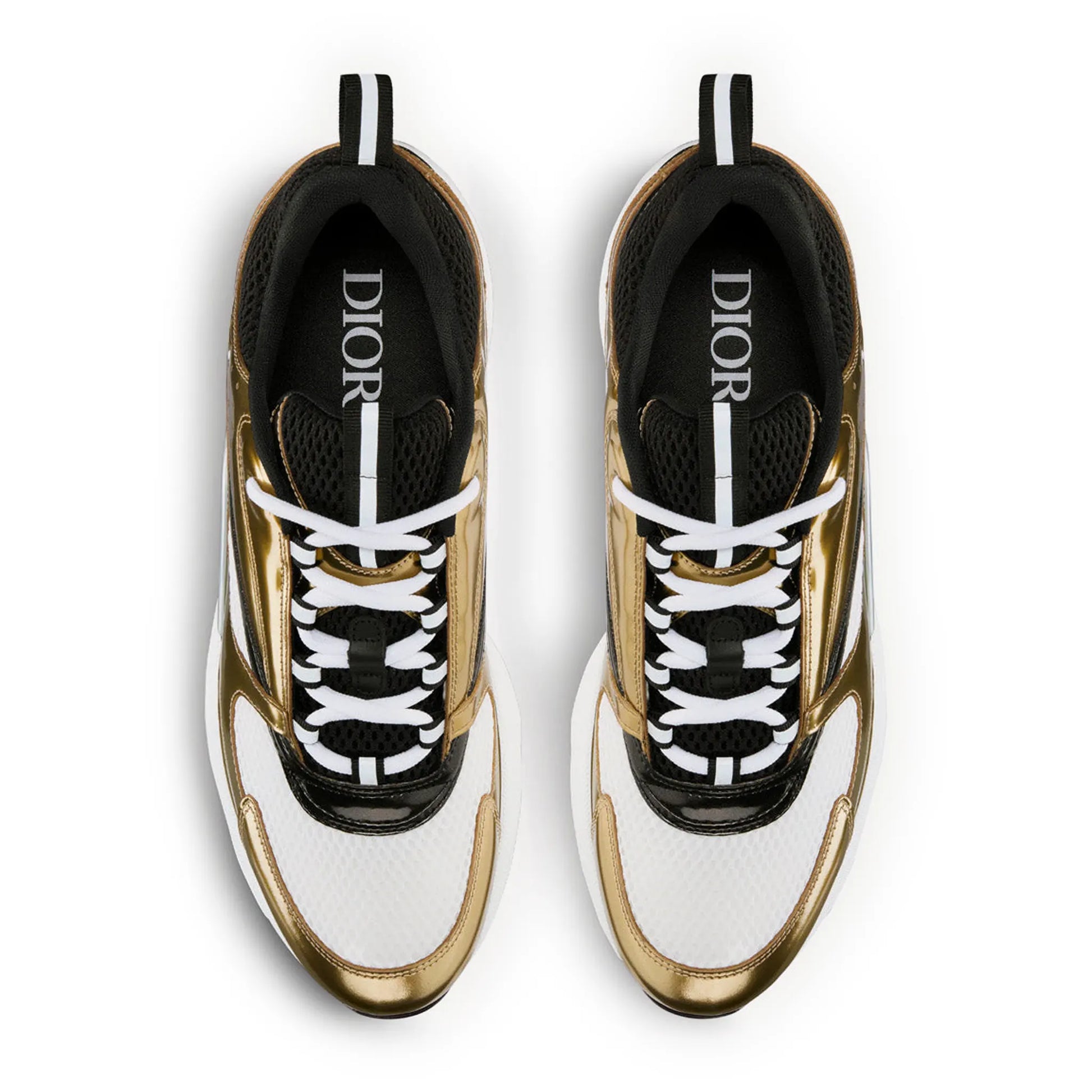 The Dior B22 White Gold Black Trainer is a striking silhouette that combines current style with classic sophistication. This trainer has a dramatic colour scheme of deep black detailing, rich gold accents and crisp white, with a dynamic blend of leather, mesh and smooth technology materials. Comfort and style are provided by the contoured sole, and a distinctive edge is added by the subdued Dior logo. The B22 reinvents ordinary footwear with a Parisian flair, making it ideal for enhancing streetwear or giving casual ensembles a luxurious touch.