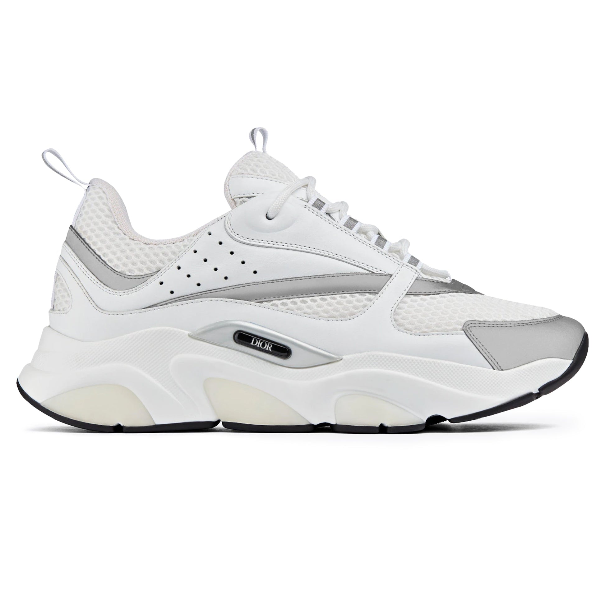 The B22 sneaker reinvents the chunky sneaker through a retro lens. Combining different materials and textures, including white and silver-tone smooth calfskin and white technical mesh, it has a bold, sports-inspired aesthetic. Round laces and a raised 'DIOR' signature on the side complement the thick white sculpted rubber sole. The sneaker can be worn with any casual outfit for a sporty and contemporary silhouette.