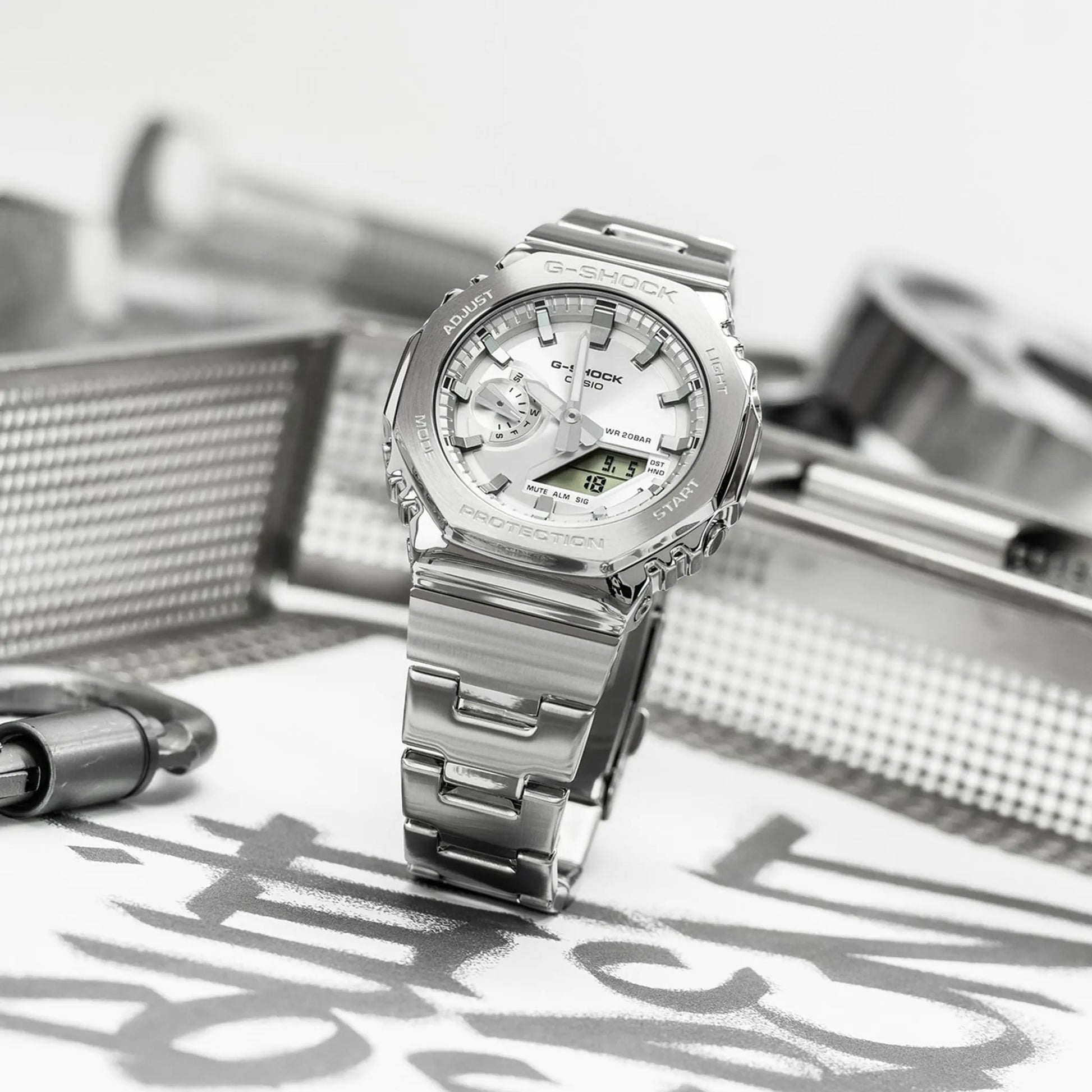 Bring a fresh look with the G-Shock Casio GM-2110D-7AER in silver. The brushed octagonal bezel and matching steel bracelet set off a monochrome dial with luminous hands, bold indices and a clean digital window. Shock resistance and 20 bar water rating handle daily bangs and swims, while stopwatch, timer, and alarms keep you on time. Street tough, wrist-ready. Pick up yours now.