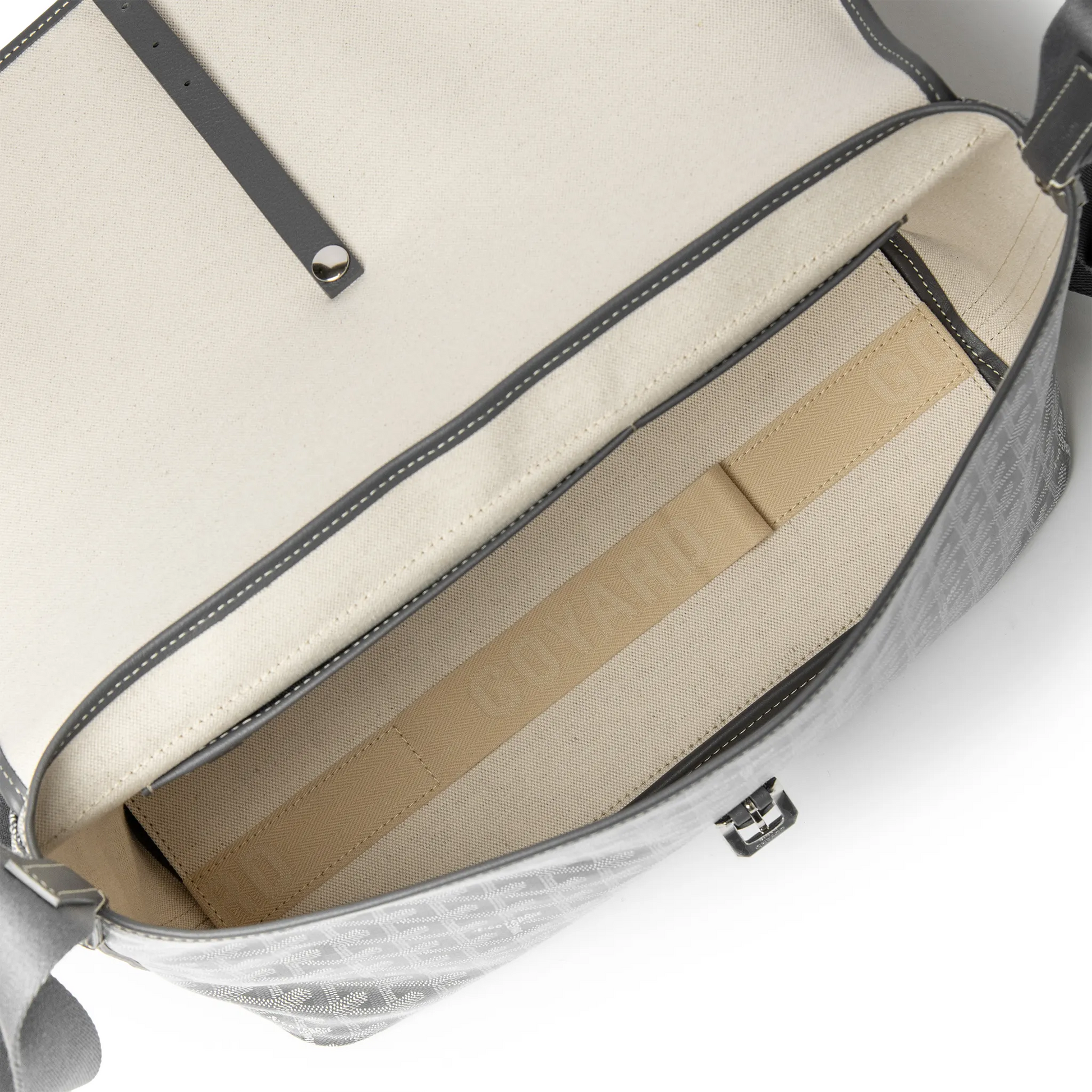 Perfect for city commutes, Goyard’s Capetien MM Messenger in Grey keeps things sharp. The signature Goyardine canvas lands in tonal chevron, trimmed with smooth leather and closed by a clean silver buckle. A wide adjustable strap wears comfortably across the body, while the structured shape fits a tablet, notebook and essentials. Understated, premium, and built to go. Secure yours now.
