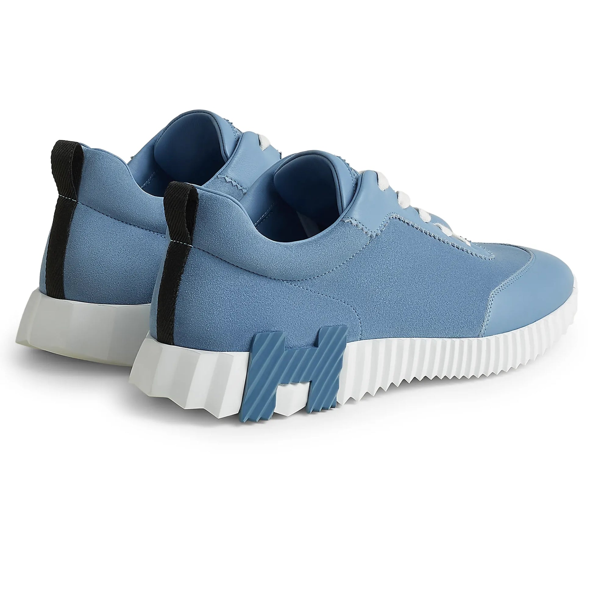 Bring a fresh look with the Hermès Bouncing Sneaker in Blue Jeans. Smooth calfskin pairs with soft neoprene side panels, finished with zigzag edges and crisp white laces. A chunky, ridged sole features signature H inserts and contrasting outsole detail for traction and attitude. Cushioned footbed and pull tab keep things easy on the move. Style with relaxed tailoring or denim. Secure yours now.