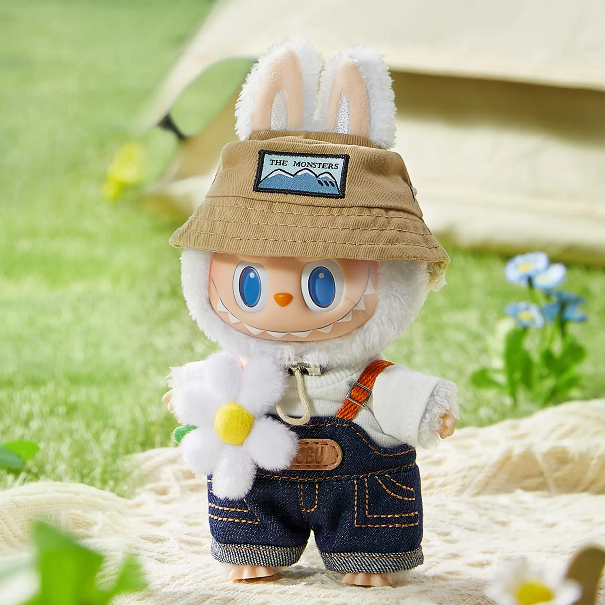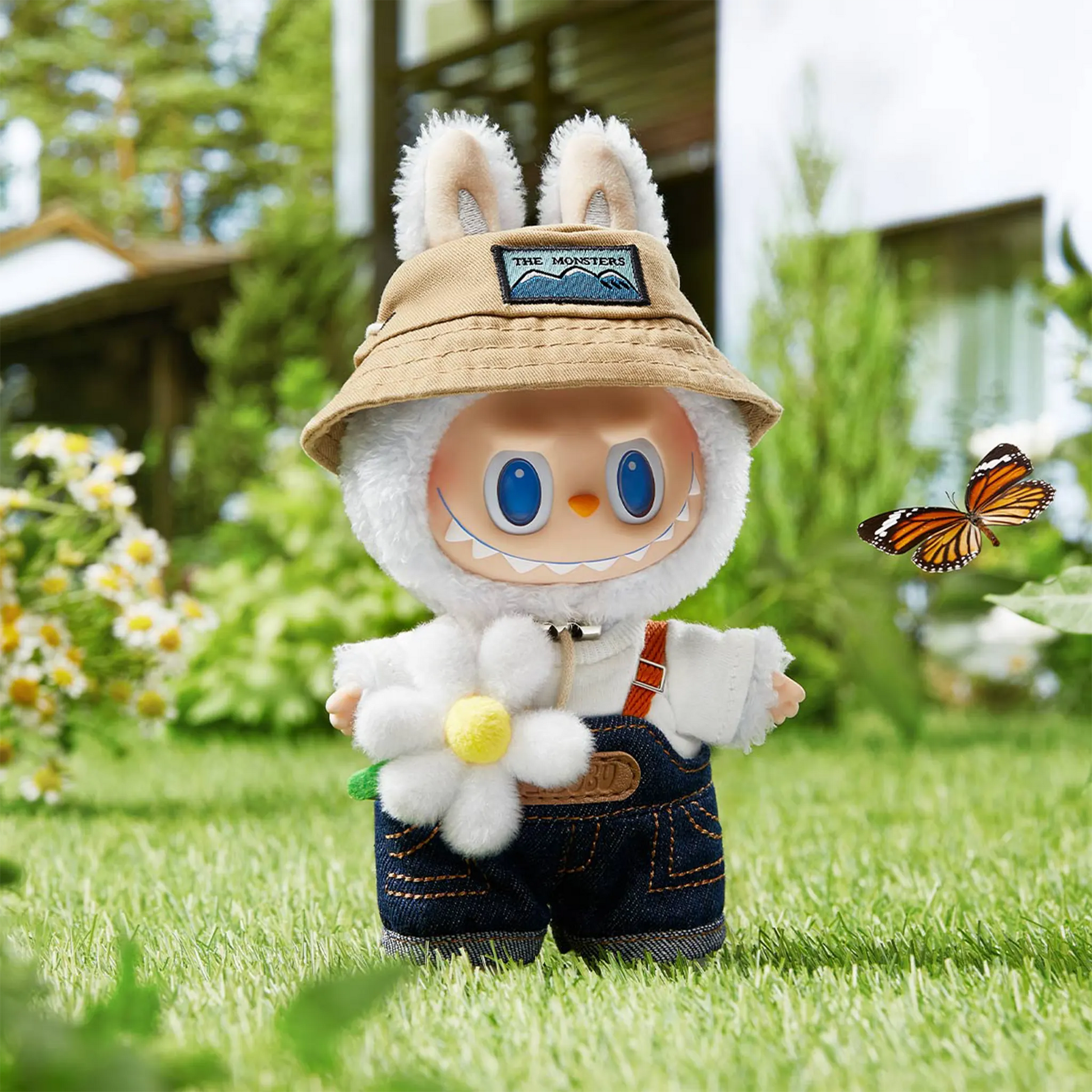 Pop Mart Labubu The Monsters Fall In Wild Vinyl Plush Pendant brings the mischief outdoors. The bunny-eared fuzzball rocks a tan bucket hat with patch, denim shorts, and orange braces, gripping a fluffy daisy. Bright blue eyes and the signature toothy grin keep the charm high. Finished with a logo strap and gold ring to hook onto bags or keys. Grab yours today.