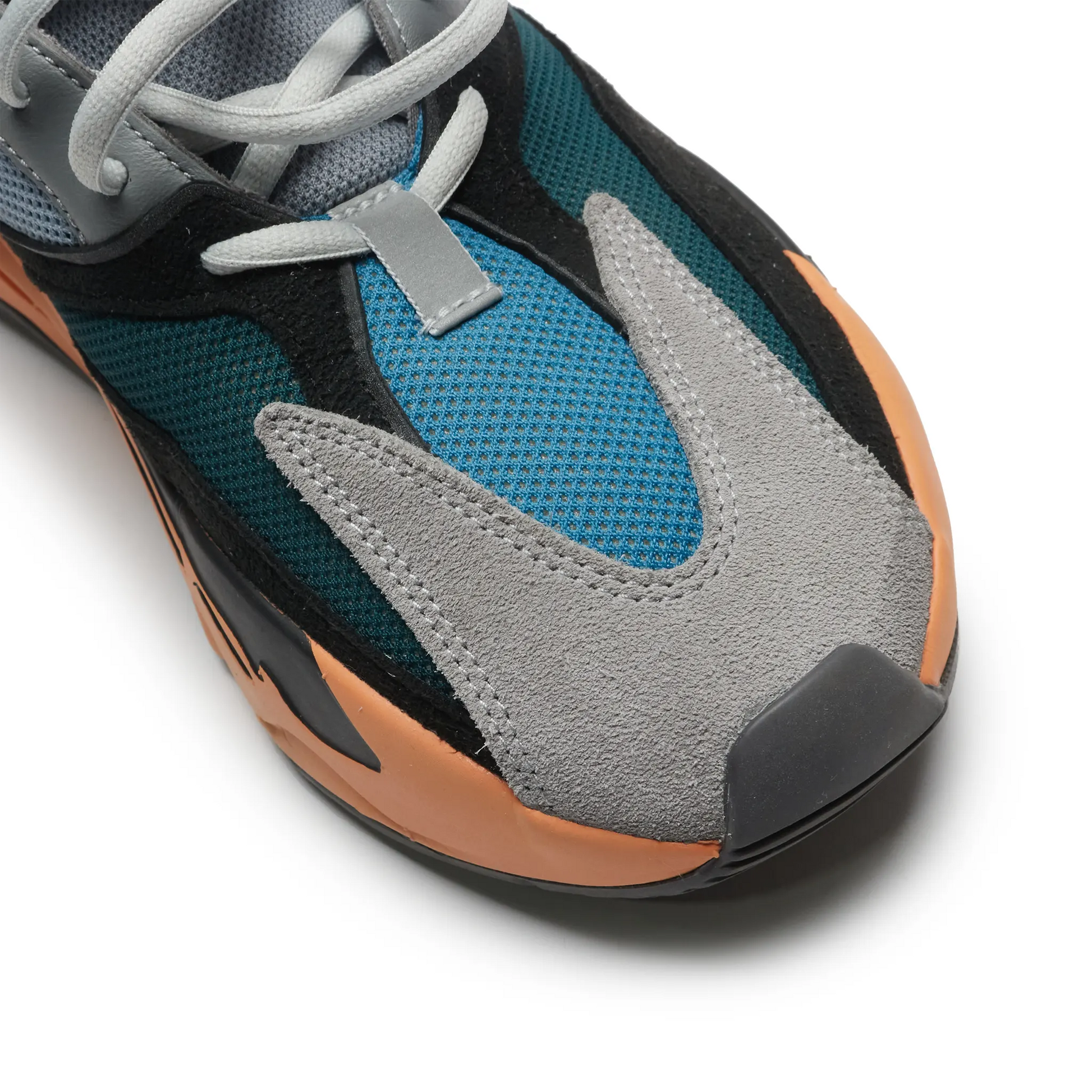 The Yeezy 700 Orange Wash returns with a grey base with black suede and blue-green mesh inserts. The Orange Wash sole with oval accents in the same colour contrasts with the black outsole.