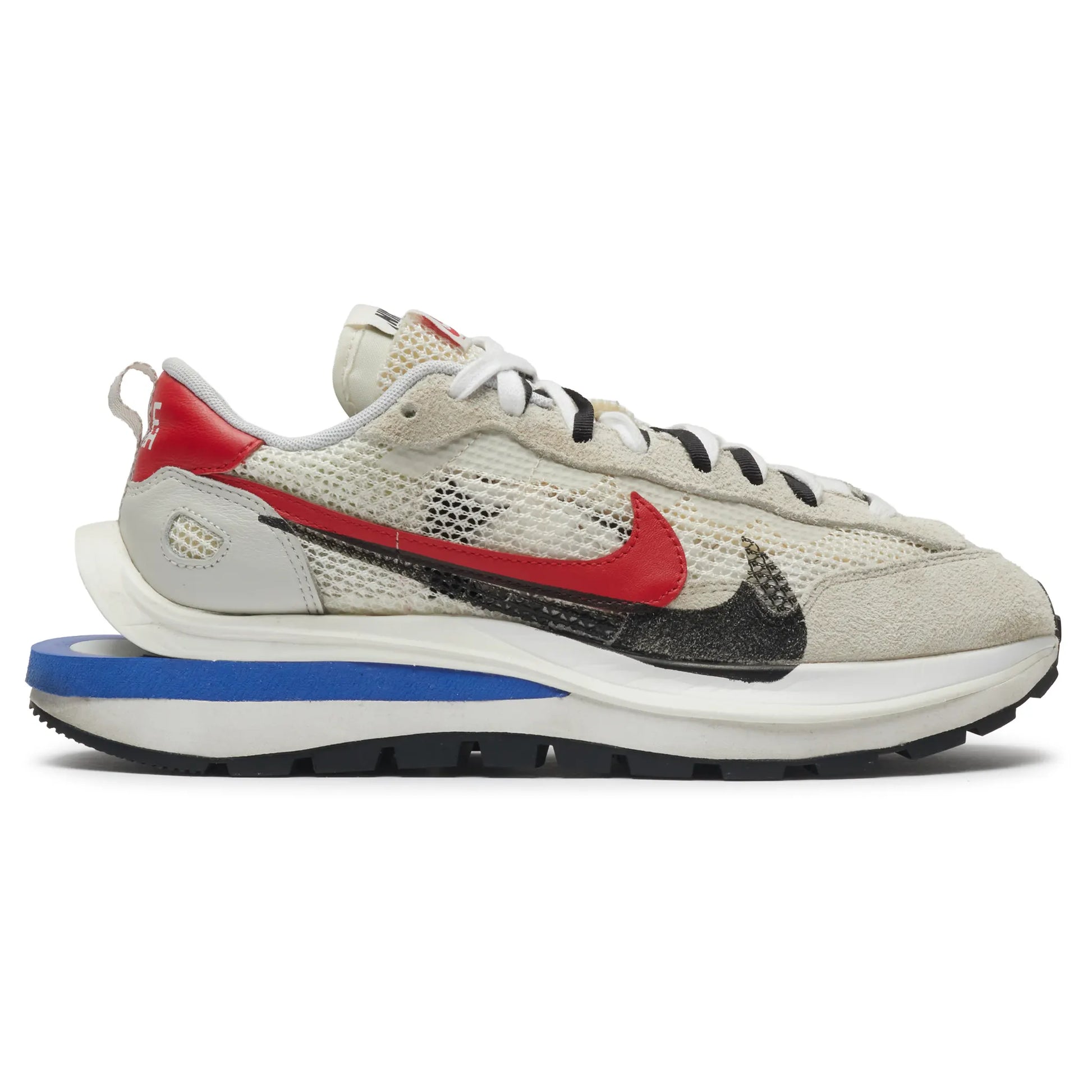 Bring a fresh look with the Nike x sacai Vaporwaffle in Sail Sport Fuchsia. Breathable cream mesh and soft suede sit above sacai’s signature stacked midsole with a bold blue insert and split heel. Dual Swooshes in red and black, double tongues and layered laces finish the hybrid design. Underfoot, a rugged waffle outsole grips. This preloved pair is cleaned and ready to wear. Shop yours before they’re gone.