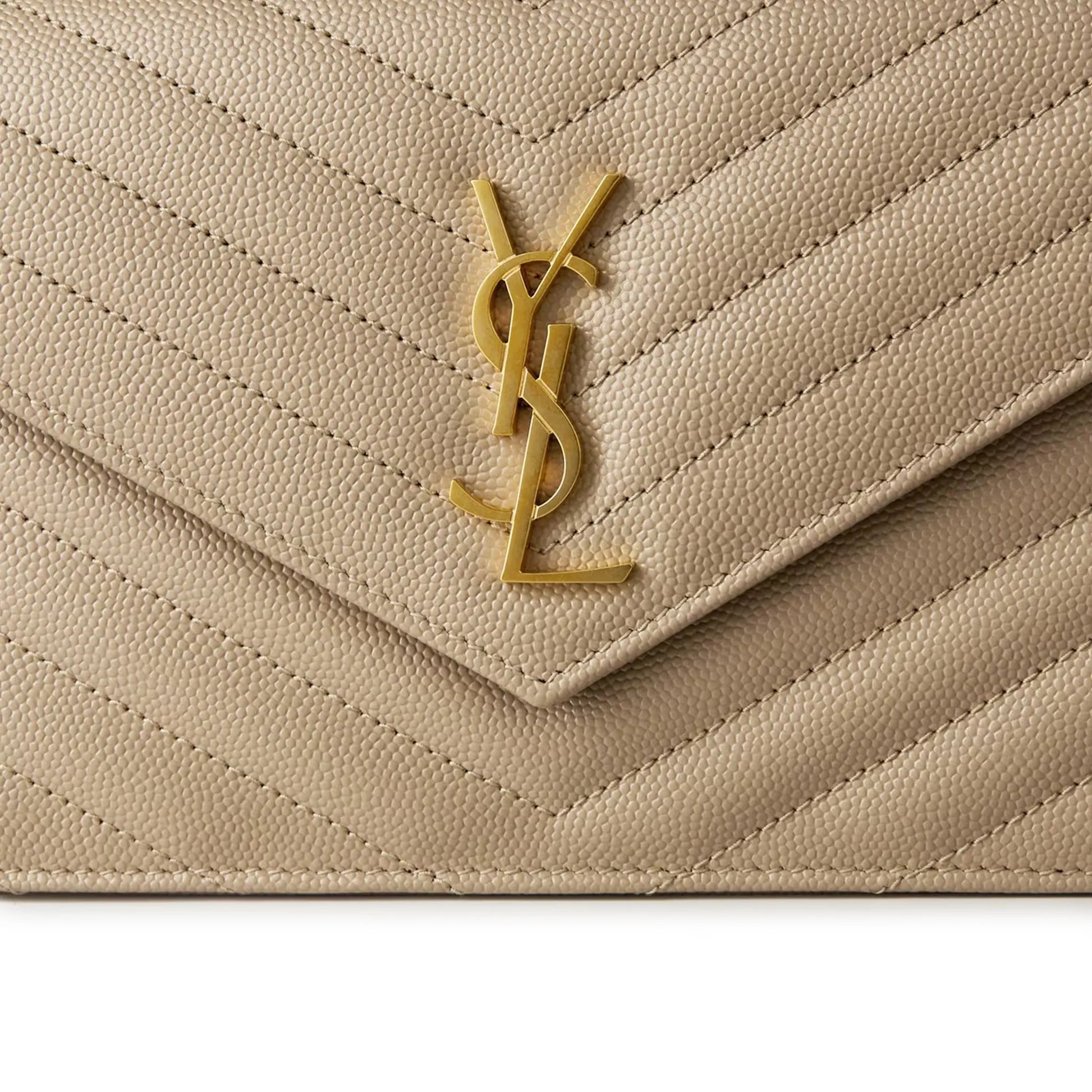 Searching for a classic bag that goes well with almost anything? The dark beige Saint Laurent Monogram Envelope Crossbody might be the perfect addition to your collection. This stylish piece, which is made of grained leather and has trademark chevron stitching, has a polished gold YSL monogram and a matching chain strap that adds the perfect amount of glitz. Its neutral colour scheme and structured design give it the subtle edge that Saint Laurent is known for, making it a simple choice for both evening wear and day dressing.