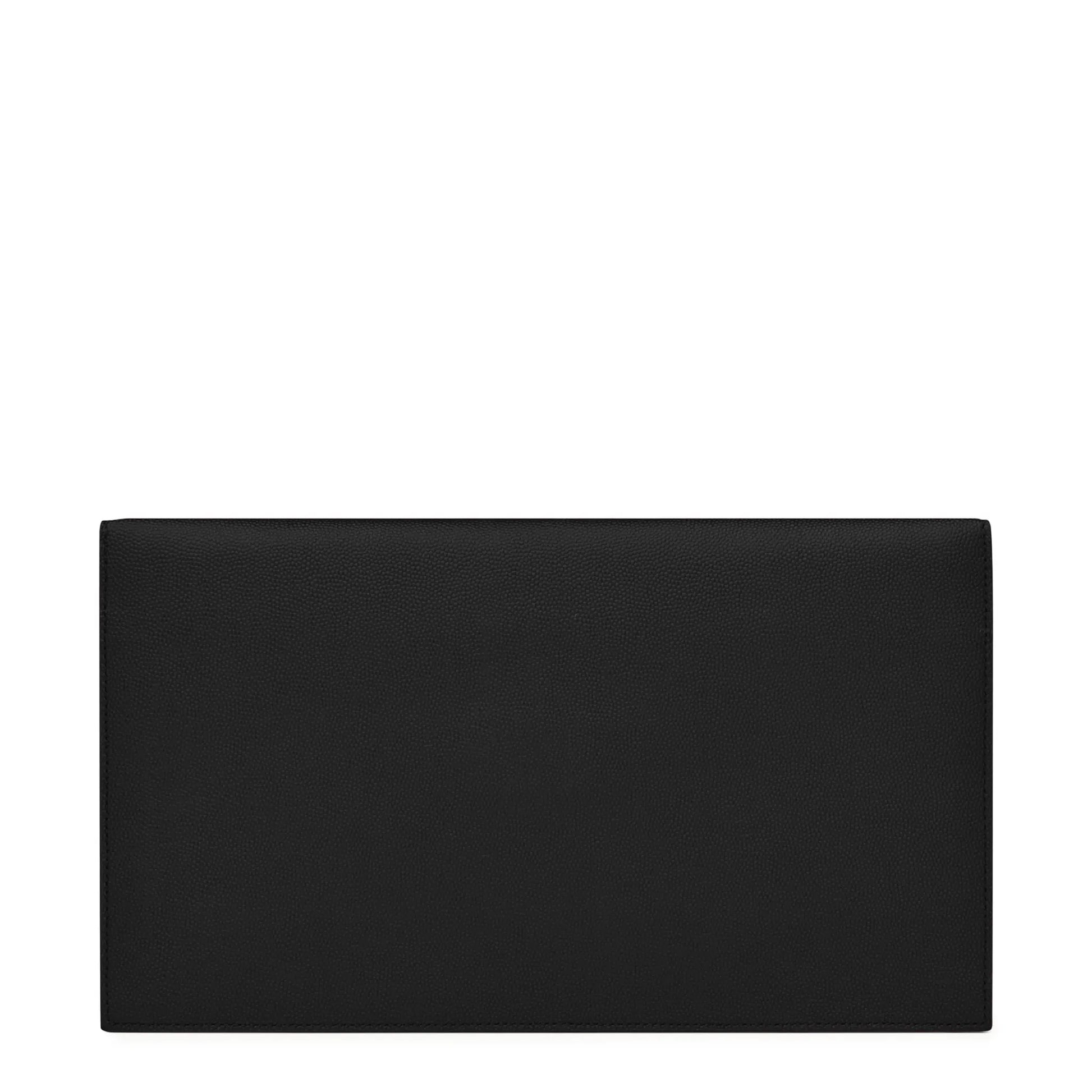 Made for evenings, the Saint Laurent Uptown Grain de Poudre Leather Black Pouch pairs sleek envelope lines with textured black leather. A gold Cassandre logo sits on the flap. All about clean lines and polish. Slim profile with magnetic closure and a lined interior to keep phone, cards, and keys organised. Works dressed up or off duty with denim and heels. Limited availability. Secure yours now.