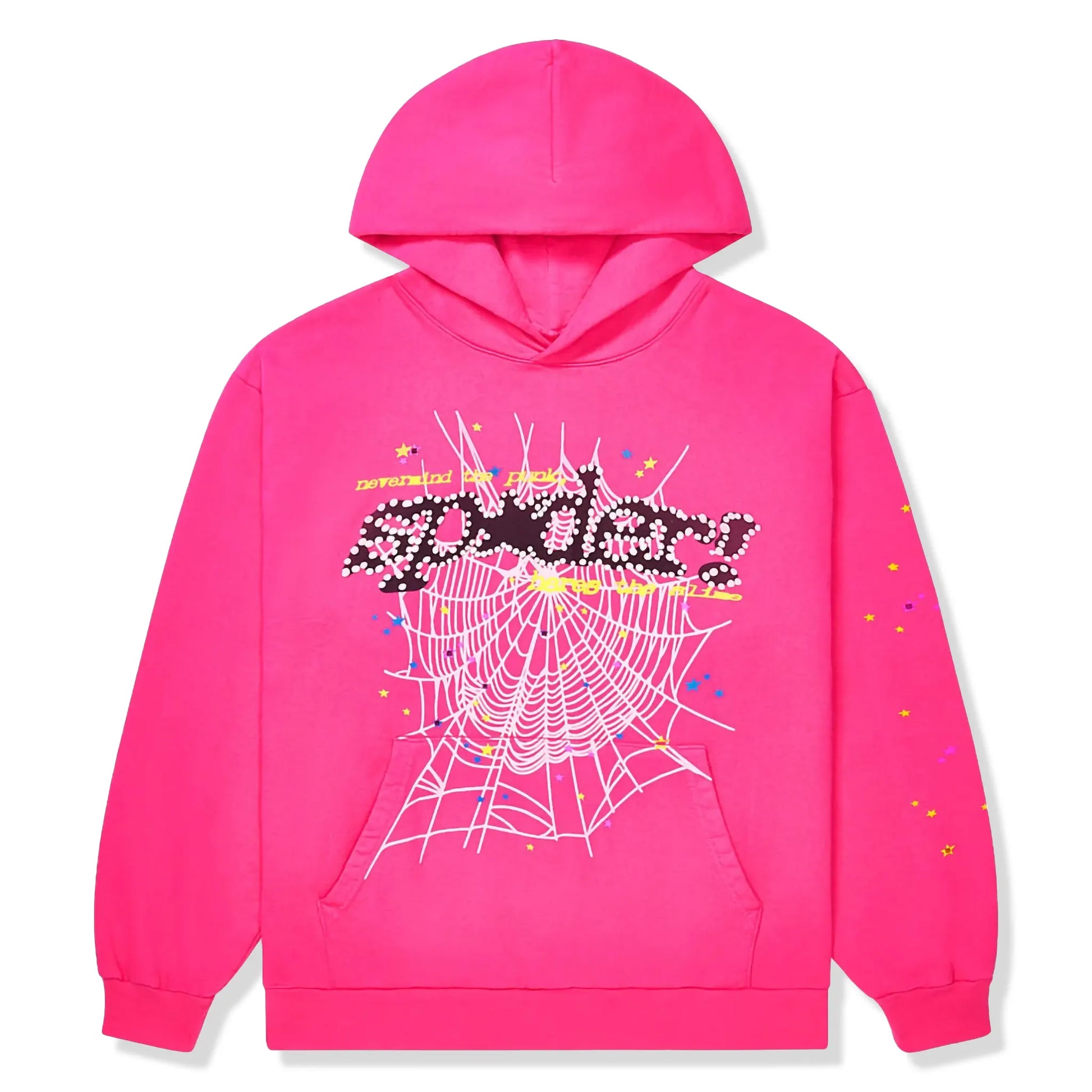 Update your rotation with the Sp5der P*nk V2 Pink Hoodie from FW23. Dropping in a bold hot pink, this pullover hits with a blown-out web graphic, dotted SP5DER logo and playful star prints across the chest, sleeves and back. Soft fleece, relaxed fit, lined hood, and a roomy front pouch keep it cosy for city runs or late nights. Shop yours before they’re gone.