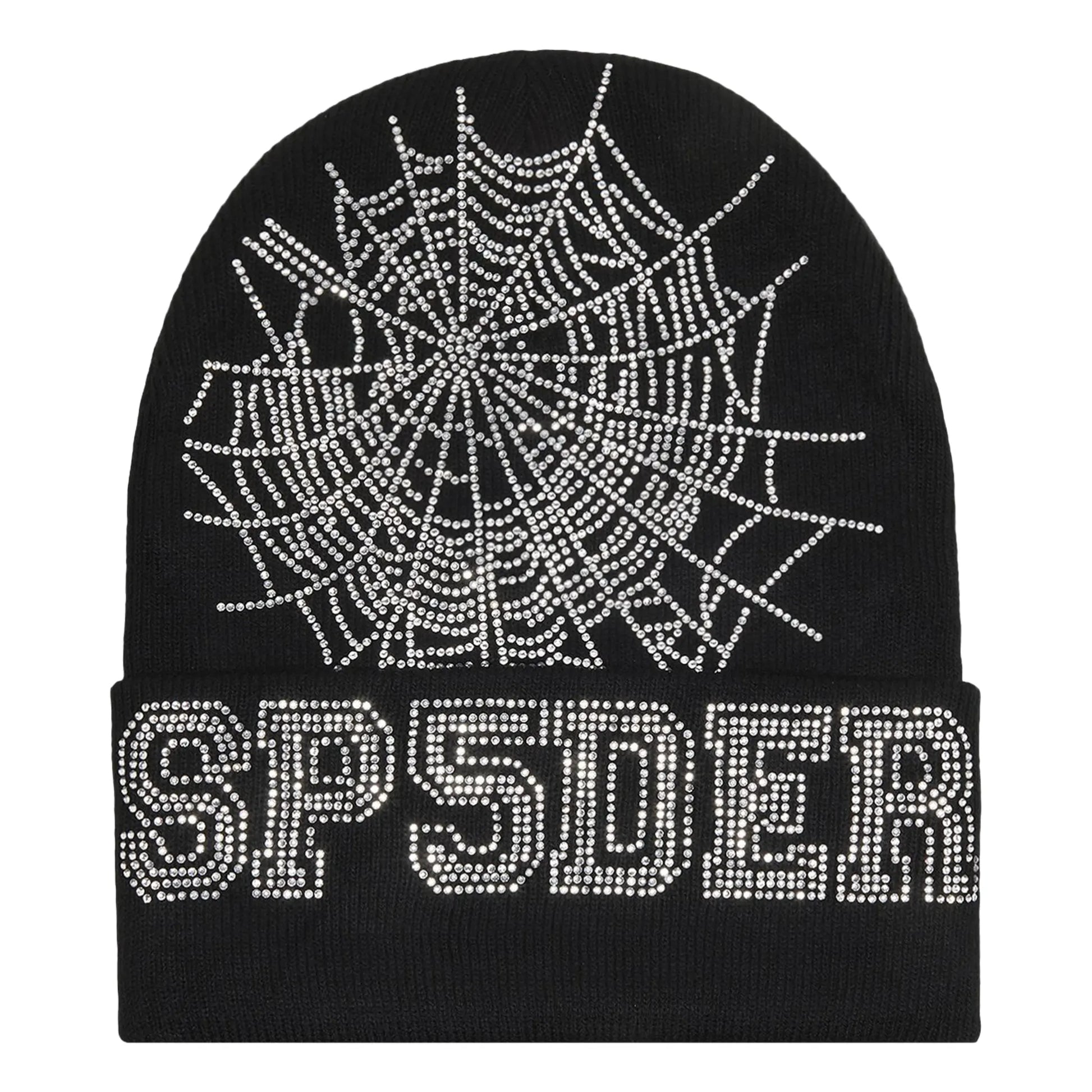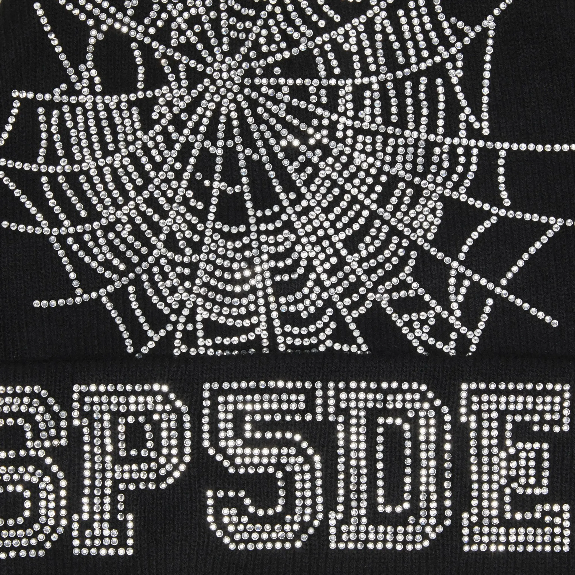 Bring a fresh look with Sp5der’s Web Beanie (FW22) in black. Ribbed knit with a fold cuff forms the base, then silver rhinestones explode into a spiderweb across the crown, with SP5DER lettering across the front. Soft, stretchy and warm, it hits just right with puffers, cargos, or hoodies, day or night. Statement sparkle for the season ahead. Secure yours now.