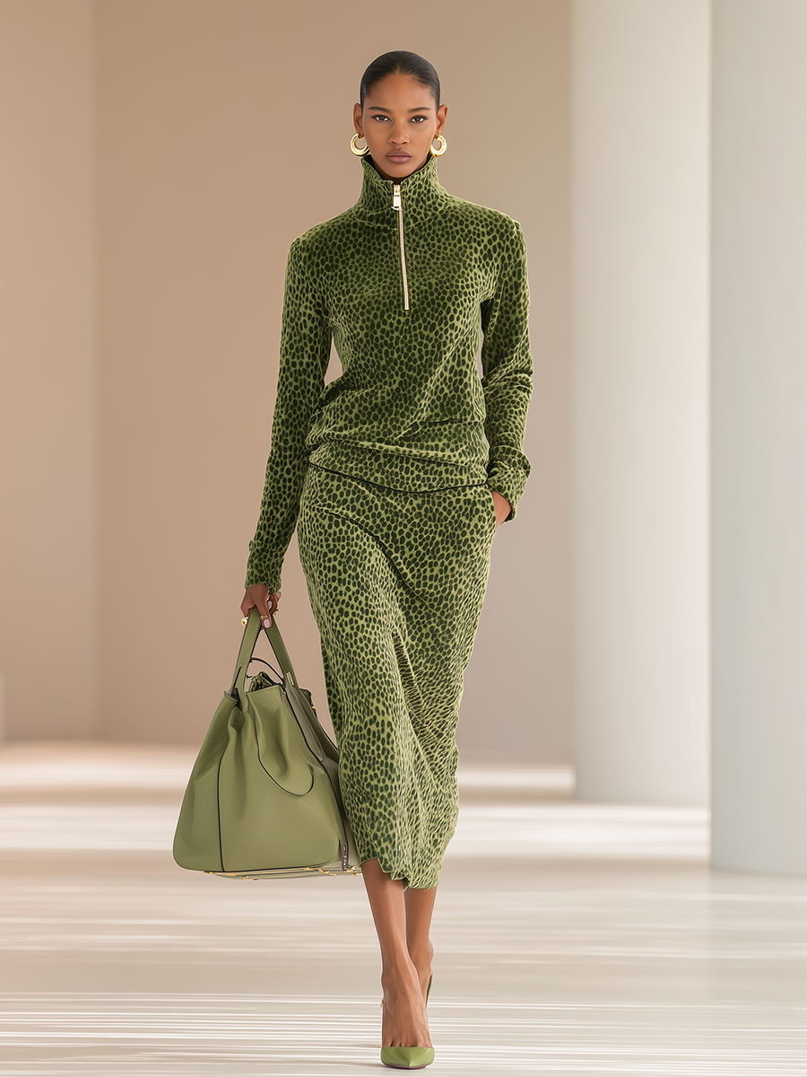 The sports retro leopard print stand collar velvet top and skirt set is a dynamic ensemble that marries athletic influences with bold, fashion-forward elements. The leopard print adds an iconic and edgy touch, while the velvet fabric brings a sense of luxury and richness, making this set stand out. The stand collar on the top offers a sporty vibe, reminiscent of classic athletic wear, and the coordinated skirt complements it perfectly, creating a cohesive look that can seamlessly transition from casual outings to more stylish occasions.