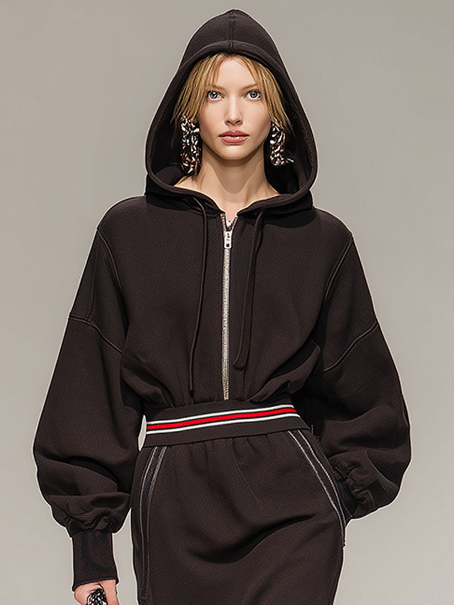 The half-zip feature adds an element of functionality and style, allowing for adjustable coverage and a customizable neckline. The midi length provides an elegant silhouette that is both flattering and practical, ideal for a variety of settings. This dress can be paired with sneakers for a casual day out or dressed up with ankle boots and statement accessories for a more refined look. Whether running errands or meeting friends for a coffee, this brown hooded half-zip dress combines effortless style with ultimate comfort.