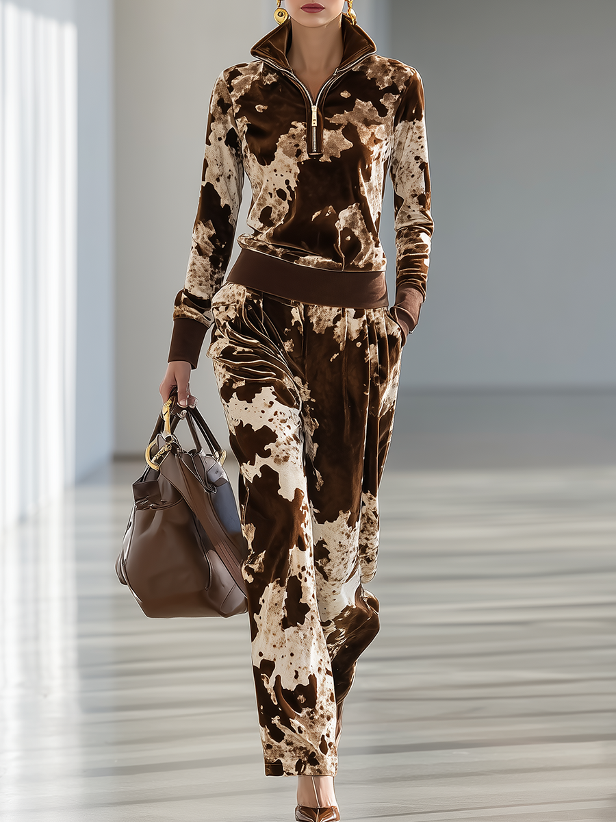 Stylish Retro Cow Print Velvet Top And Wide-leg Pants Set