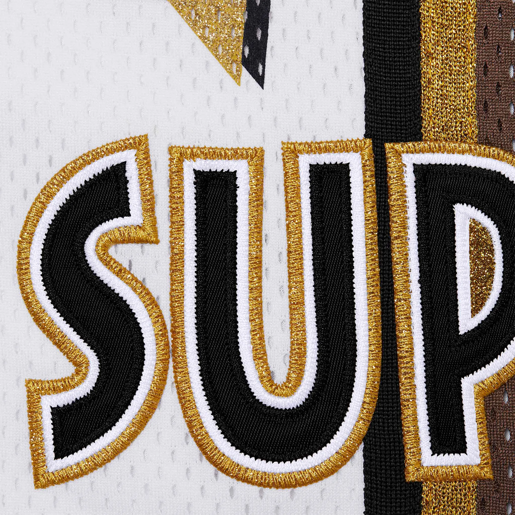 Supreme’s All Star Basketball White Shorts bring retro all-star flavour to SS25. Breathable white mesh is trimmed with brown side panels, black piping, and metallic gold star hits, finished with a bold 25 at the hem and SUPREME lettering wrapping the leg. An elastic waist with drawcord secures the fit, while roomy legs fall just above the knee. Game-ready and street ready, add them to your rotation today.