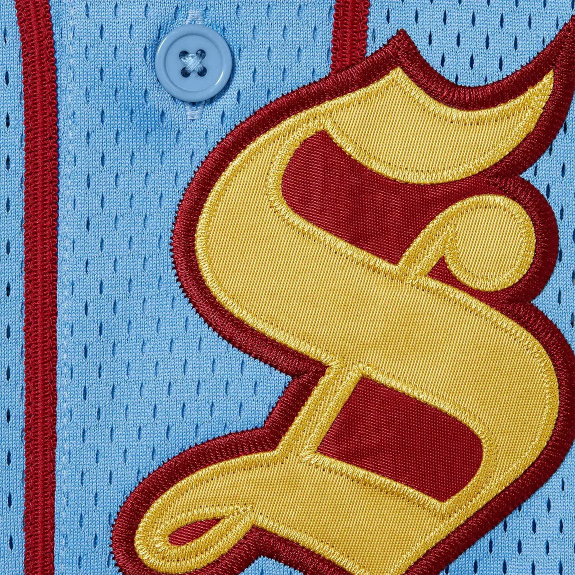 The Supreme Old English Blue Baseball Jersey gives a traditional athletic silhouette a modern twist. It has a distinctive Supreme edge and is made of breathable mesh in a stunning blue colour with Old English text across the chest. Subtle branding gives just the right amount of streetwear flair, while the loose fit and button-up style evoke memories of vintage baseball. It's a unique garment that seamlessly combines sport with style, whether it's worn alone or layered.
