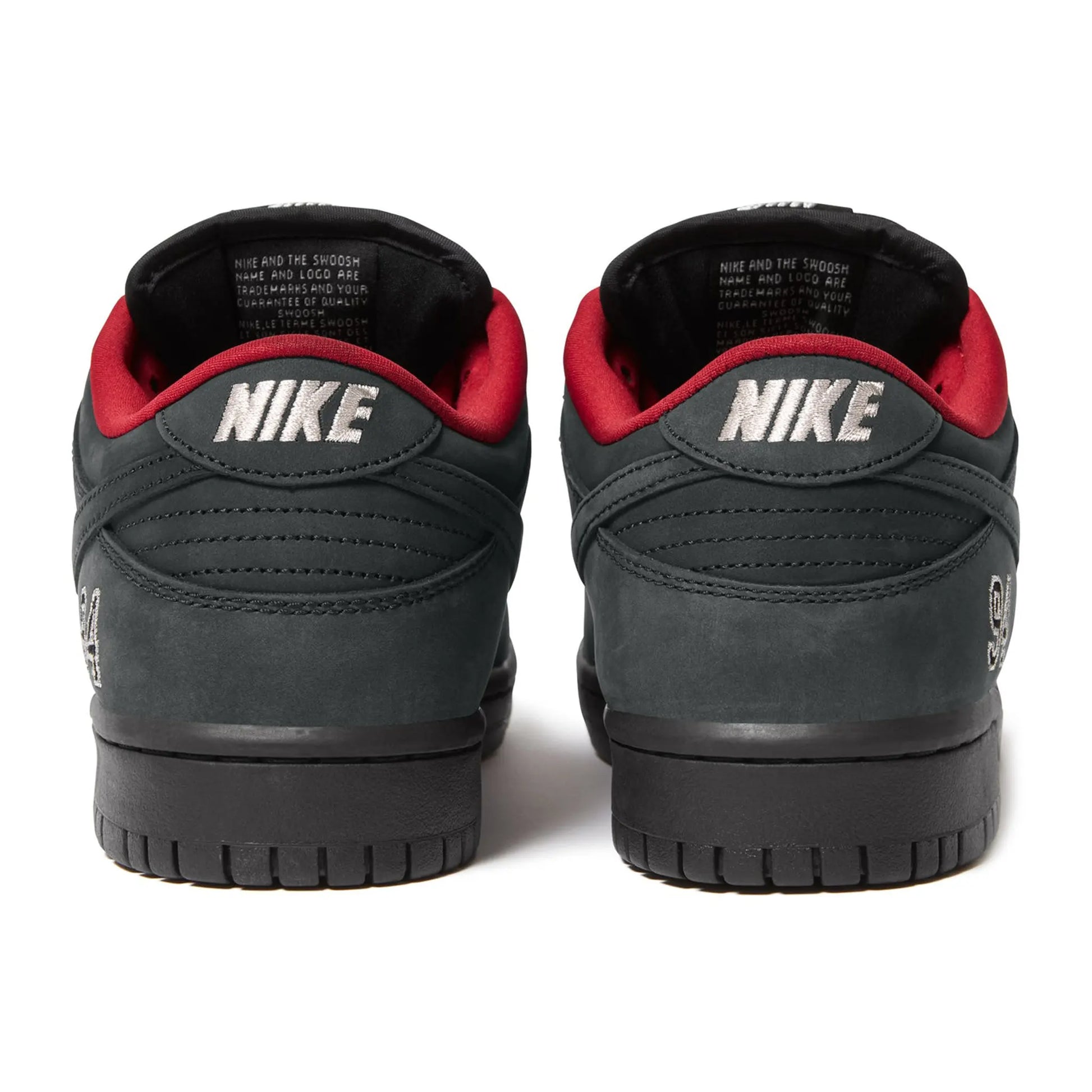 Step up your style with the Supreme x Nike SB Dunk Low Black, built in smooth nubuck for a stealth finish. A tonal Swoosh rides the sidewalls, while the red collar pops against the all black upper. Signature hits include 94 heel embroidery and a debossed Supreme stamp on the midsole. Padded tongue, Zoom Air cushioning and a grippy cupsole keep you locked. Secure yours now.
