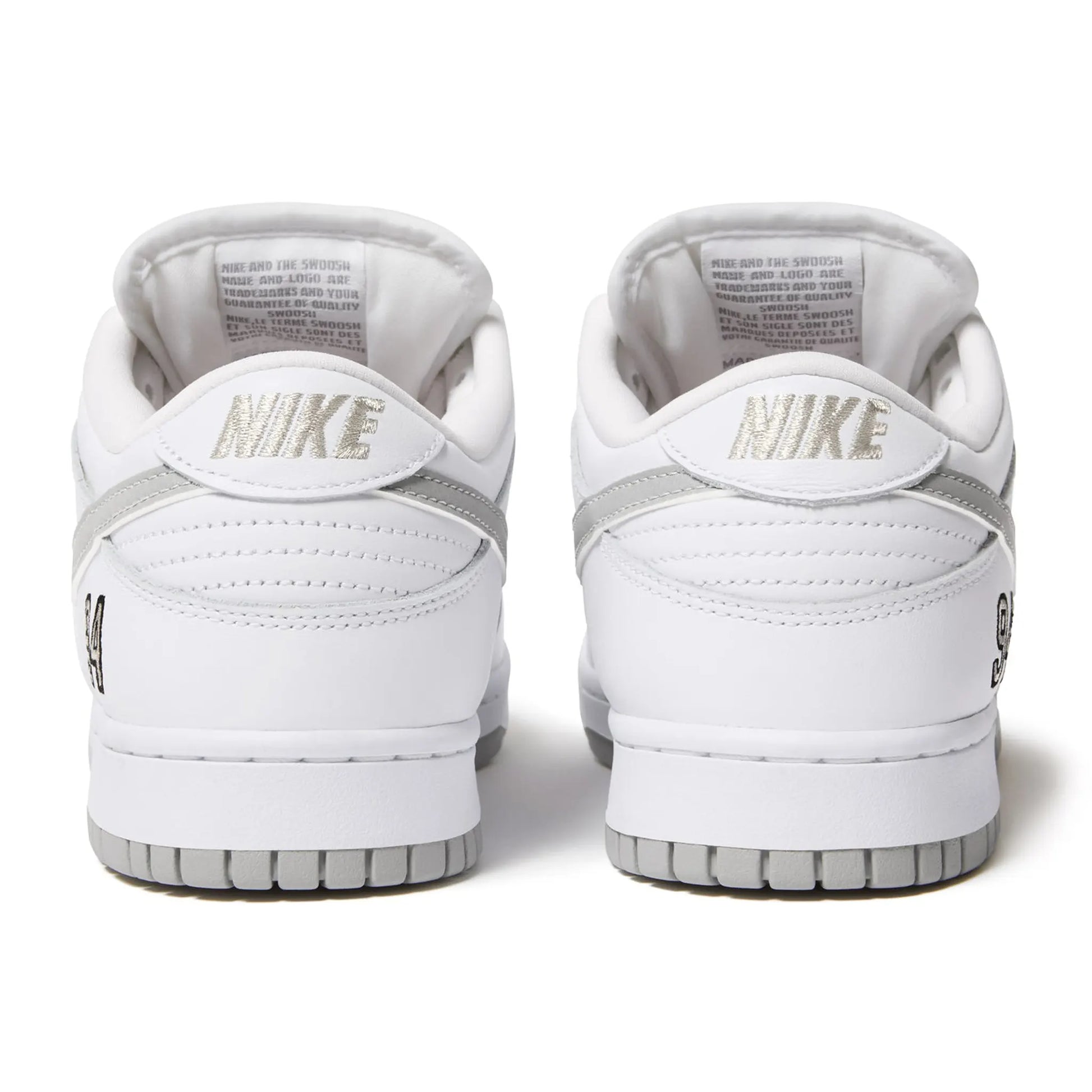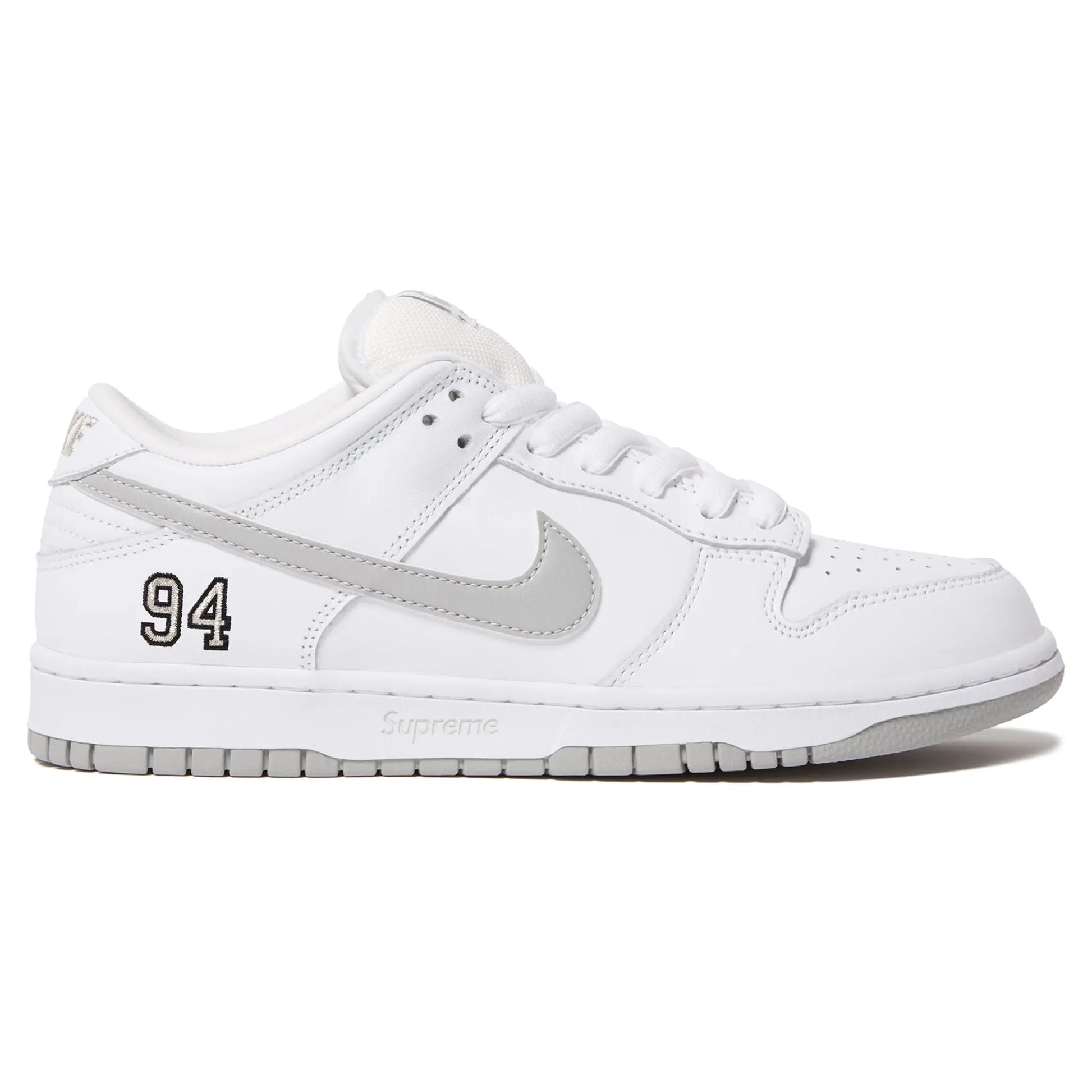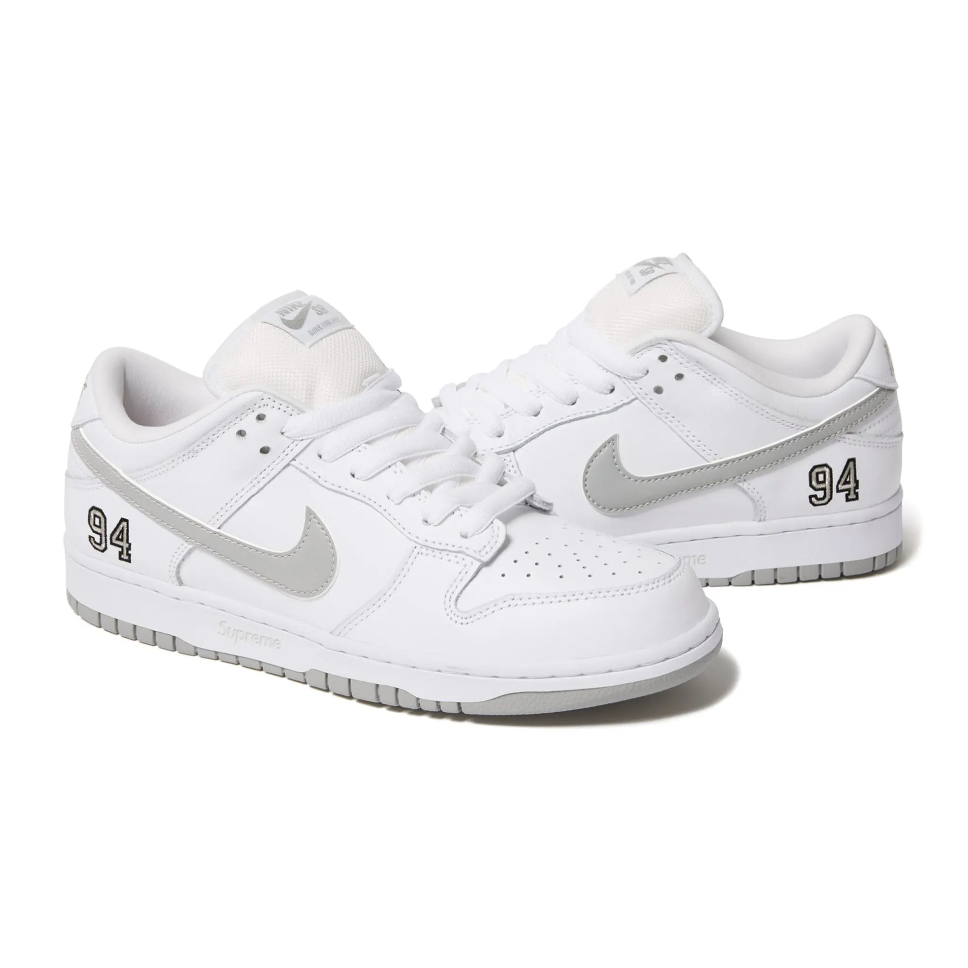 Supreme x Nike SB Dunk Low in white. Smooth leather uppers sit on a grey cupsole, with a metallic silver Swoosh, perforated toe and padded tongue. Co-branded hits include Supreme debossing on the midsole and bold 94 embroidery at the heel. Clean, skate born style that still works with denim or sweats. Cop yours right here.