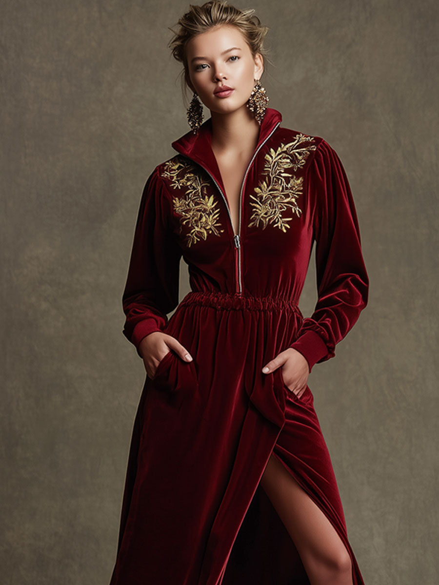 Trendy Retro Half-zip Long-sleeved Embroidered Deep Red Velvet Slit Maxi Dress