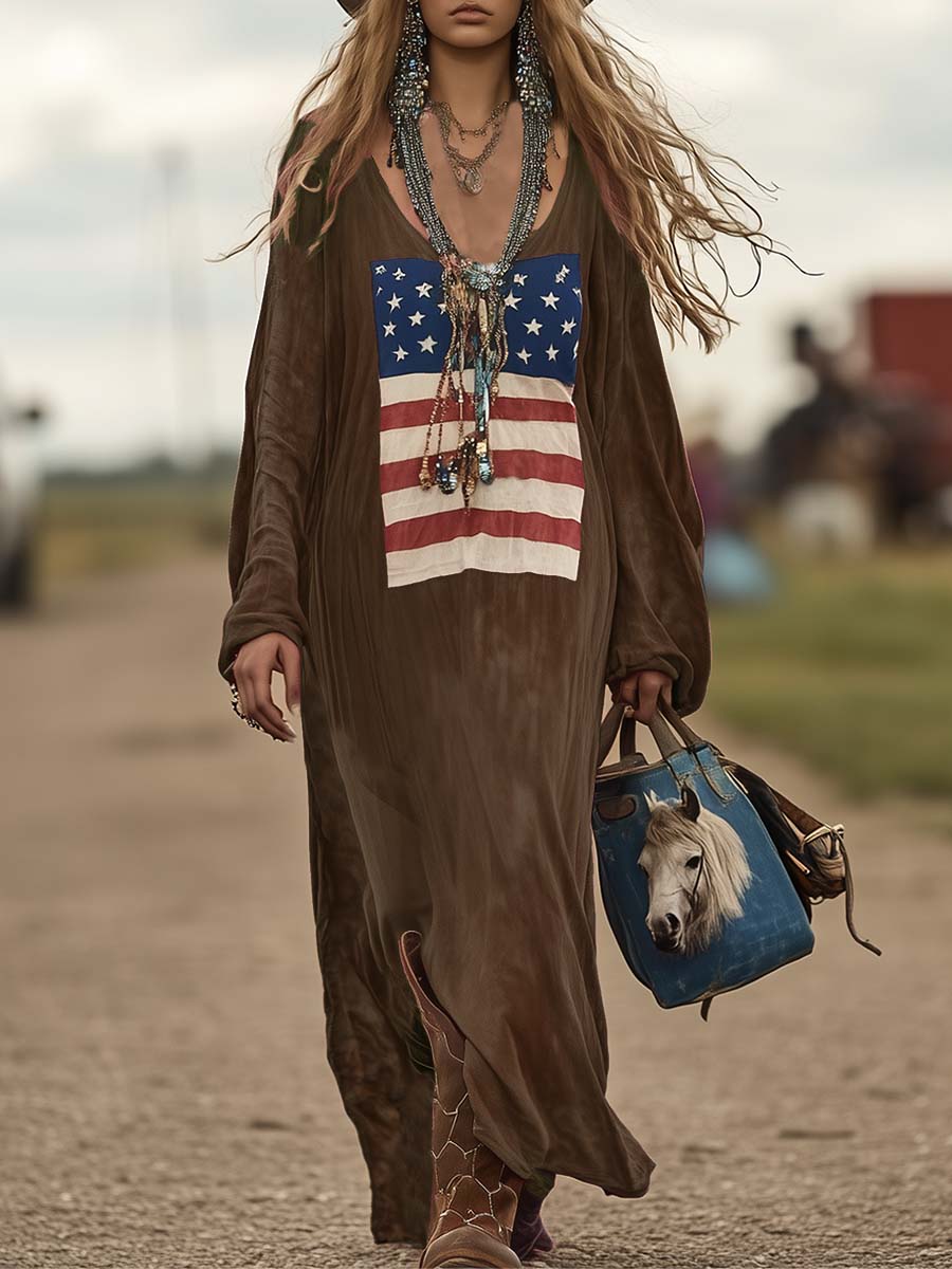Vintage Casual Western Long Sleeve Flag Print Pink Cotton Loose Maxi Dress