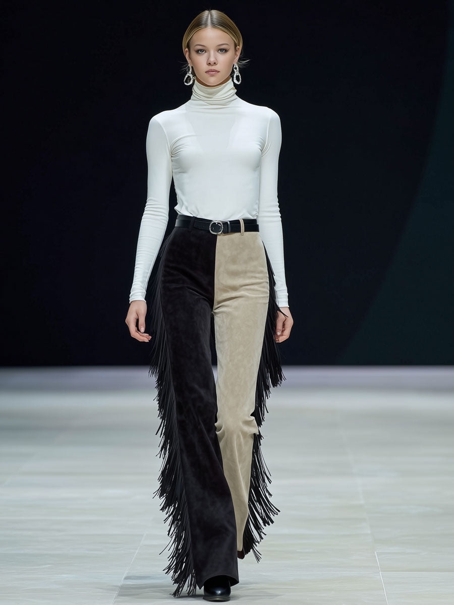 Western Retro-style Fringed Color-blocked Faux Suede Pants