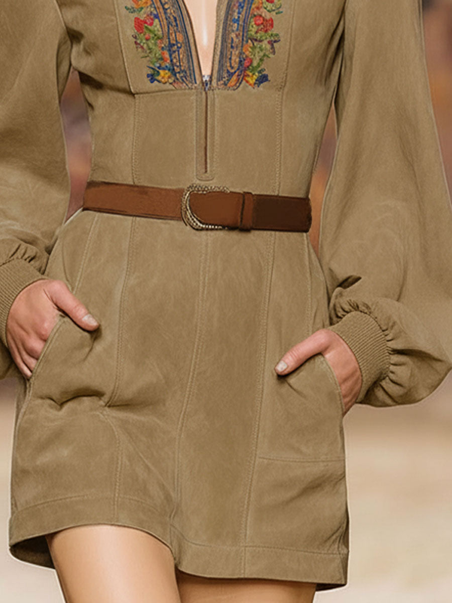 Western-style Floral Embroidered Lapel Zipper Faux Suede Long-sleeved Mini Dress
