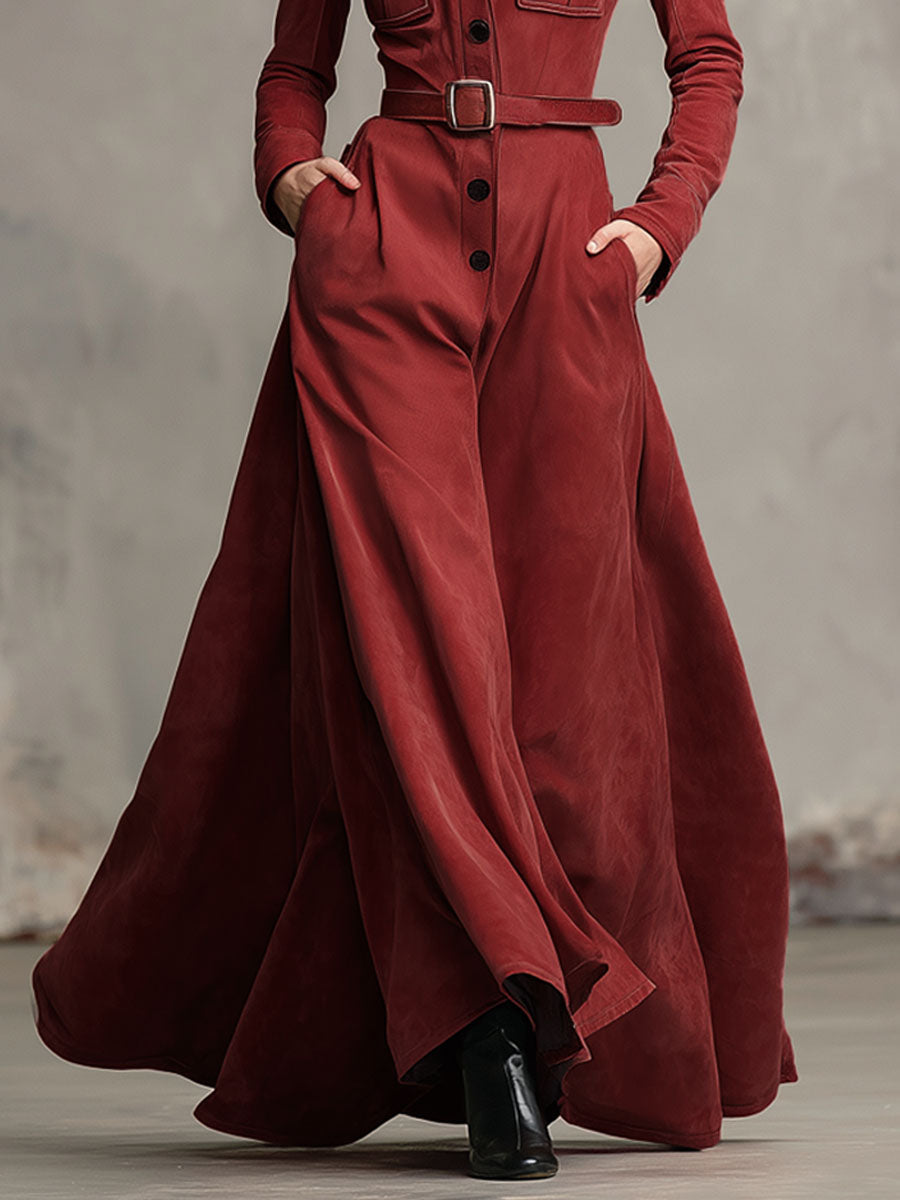 Western-style Lapel Multi-pocket Single-breasted Faux Suede Maxi Dress